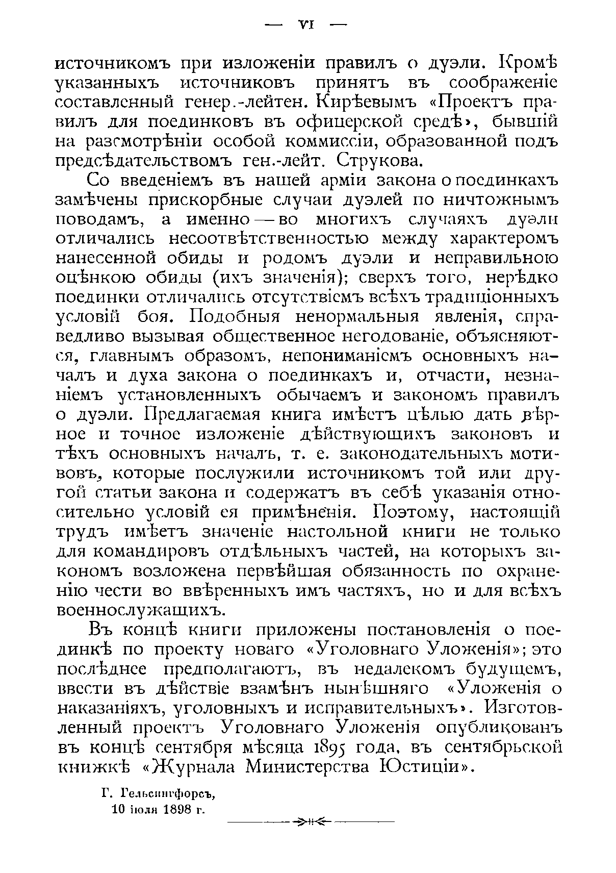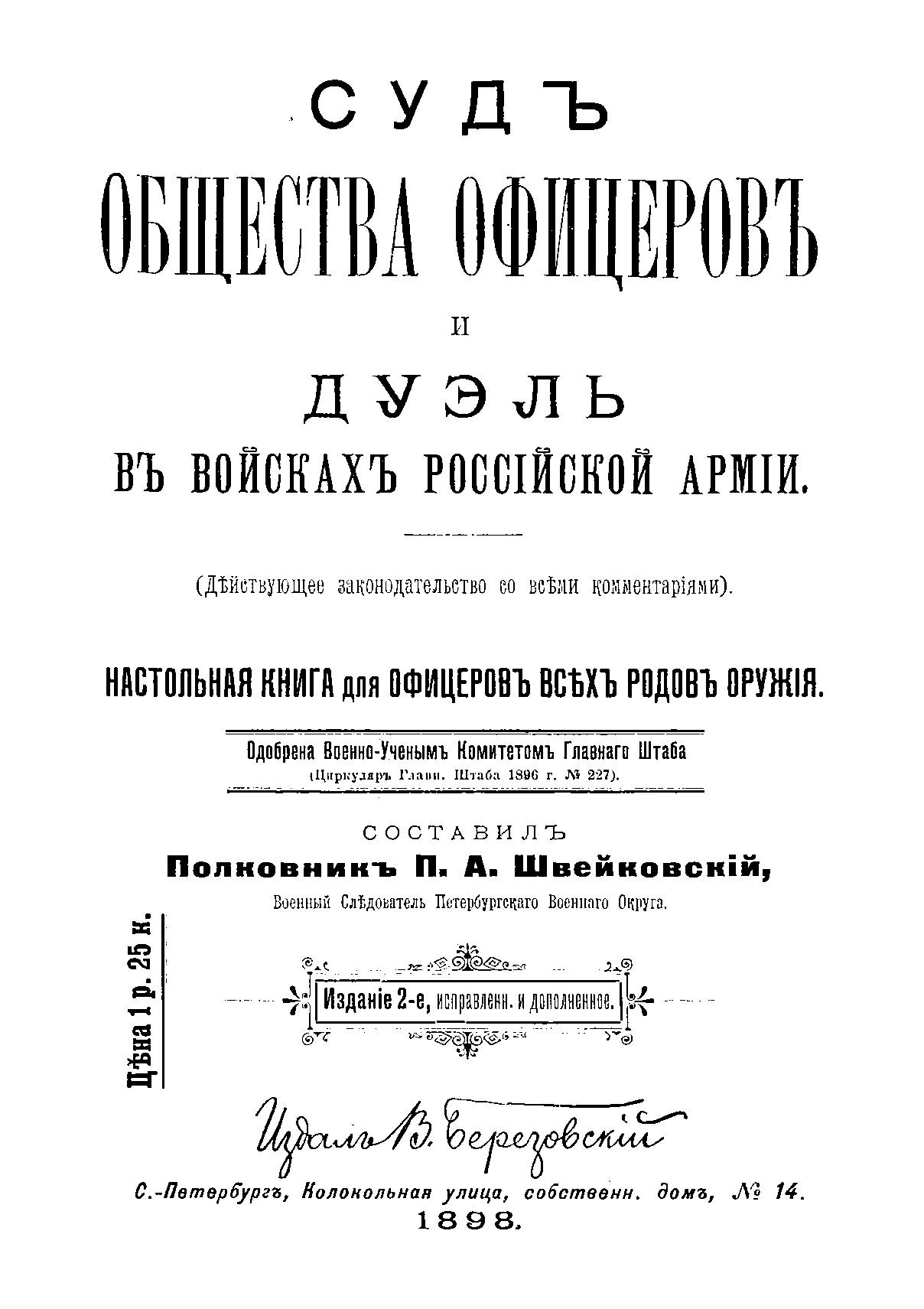 Монография военного следователя Петербургского военного округа полковника П. А. Швейковского посвящена детальному исследованию дуэльного кодекса и правилам дуэли, разрешенной в Российской императорской армии приказом по Военному ведомству от 18 мая 1894 г. Вместе с тем, автор обращает особое внимание в своей работе на усиление роли судов офицерской чести или судов общества офицеров в войсковых частях для урегулирования взаимоотношений в офицерской среде. Предлагаемый на суд заинтересованного читателя труд Швейковского снабжен многочисленными законодательными актами и подзаконными установлениями, позволяющими детально разобраться в дуэльном законодательстве Российской империи.