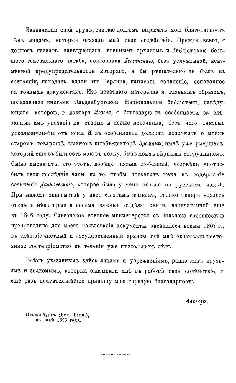 Перевод на русский язык фундаментального многотомного военно-исторического труда по истории войны русско-прусского союза с Наполеоном в 1806-1807 годах, написанного немецким военным историком Оскаром фон Леттов-Форбеком, был подготовлен при штабе Варшавского военного округа под руководством генерал-лейтенанта Генерального штаба, профессора военной истории академии Генерального штаба А.К. Пузыревского, получив при этом одобрение Военного министерства. Деятельность А.К. Пузыревского как одного из выдающихся военных педагогов и просветителей получила в России широкую известность. Представленное им исследование немецкого военного писателя, снабженное многочисленными картами и схемами боевых действий, сих пор представляет научный интерес. Одним из важнейших достоинств данного исследования является то, что автор широко использовал богатейший документальный массив как прусских, так и французских военных архивов, создав объективную картину одного из сложнейших этапов эпохи наполеоновских войн. Русско-прусско-французская война 1806-1807 гг. война между 4-й коалицией европейских держав (Великобритания, Россия, Пруссия, Саксония, Швеция) и наполеоновской Францией. Фактически эти две кампании являлась продолжением русско-австро-французской войны 1805 г. Не имея общего плана войны, союзники действовали несогласованно, что позволило Наполеону разбить их поочерёдно. Так 2 (14) октября 1806 г. в масштабном сражении под Йеной и Ауэрштадтом французская армия разгромила прусско-саксонские войска, после чего наполеоновские войска оккупировали большую часть Пруссии и 12 (24) октября заняли Берлин. Русская армия в составе трёх корпусов (около 160 тыс. чел.) под командованием генерал-фельдмаршала М. Ф. Каменского сосредоточилась в районе Пултуск, Остроленка, Брест-Литовск, выдвинув передовые отряды к Висле. 16 (28) ноября французские войска заняли Варшаву. Наполеон предпринял попытку окружить главные силы русских войск, но 14 (26) декабря в сражении под Пултуском русские войска сорвали этот план, нанеся поражение корпусу маршала Ж. Ланна. Затем русская армия отошла в район Тыкоцина, а наполеоновские войска расположились на зимние квартиры. 4 (16) января 1807 русская армия под командованием нового командующего генерал-адъютанта Л.Л. Беннигсена начала наступление из района Бялы в Восточную Пруссию с целью не допустить занятия французами Кенигсберга и Пиллау и нанести поражение изолированным корпусам Нея и Бернадота. Наполеон, узнав о продвижении русских войск, 20 января (1 февраля) направил главные силы на север, пытаясь обойти левый фланг русской армии и отрезать экспедиционные силы русских от России. Русские войска, ведя арьергардные бои, отошли к Прейсиш-Эйлау, где 26–27 января (7– 8 февраля) произошло встречное упорное сражение, в котором русские войска успешно отразили удары наполеоновской армии. 2 (14) июня 1807 г. в сражении под Фридландом русская армия, проявив чудеса героизма и мужества, вследствие неадекватных мер командования, была вынуждена отступить. В июне 1807 г. состоялось свидание Наполеона с императором Александром I в Тильзите и был подписан тяжёлый для России вынужденный союзный договор с наполеоновской Францией. Все эти военно-исторические события детально изложены в данном труде.