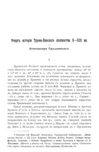 На историко-филологическом факультете Киевского университета св. Владимира в конце XIX в. велась серьёзная научная работа по изучению истории Древней Руси. Результатом этой работы явилась серия областных монографий. В эту серию входит и предлагаемое исследование Александра Грушевского. Его первая часть знакомит с историей Турово-Пинского княжества XI – XIII, находившегося в бассейне реки Припять.