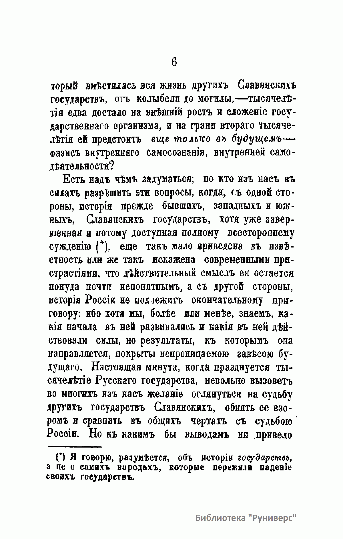 Популярная занимательная брошюра, посвященная предстоявшему в 1862 г. торжественному празднованию 1000-летия российской государственности (Тысячелетию России) принадлежит перу выдающегося отечественного славяноведа, прекрасного знатока истории, культуры, языка и верований славянских народов Александру Федоровичу Гильфердингу, автору значительных исследований в области общеславянской филологии. Автор, отмечая уникальность российской государственности, в весьма простой и доступной форме на примерах других славянских народов (государственных образований – мораван, чехов, поляков, словаков, хорватов, болгар и сербов), проводит сравнительный анализ причин распада славянских государств. Автор подробно останавливается на описании истории Чехии, оказавшейся, как и Польское государство, в орбите католической церкви и западноевропейской цивилизации в целом. Это «губительное», по мнению Гильфердинга, цивилизационное влияние настойчиво подавляло «стихию славянского начала», когда «Чешское государство стояло на высоте своего политического могущества». Именно этого удалось избежать российской национальной культуре, не подвергавшейся столь сильному влиянию западноевропейской (римско-католической, а затем протестантской) традиции, что и позволило восточнославянскому этносу сохранить свою самобытную государственность, достигнув тысячелетнего существования. Популярное исследование Гильфердинга весьма актуально в нынешних условиях преобразования современной России, отмечающей 1150-летие создания своей государственности.