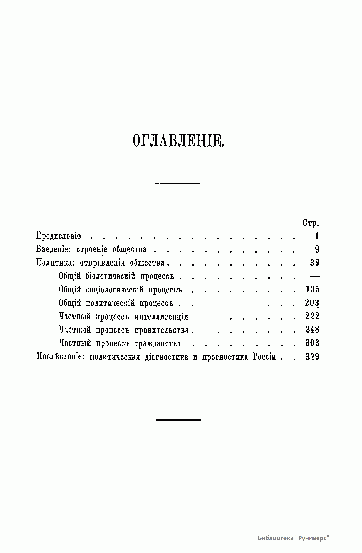 «Наука политики» для автора выступает в качестве компонента общей социологии и, анализируя в книге политические отношения в России, он использует идеи и принципы О.Конта и Г.Спенсера. Стронин выделяет три основных закона функционирования «социального тела»: общий биологический закон; общий социологический закон: общий политический закон. Социология политики для него подразделяется на прикладную и фундаментальную теорию, что определяет структуру данной работы: одна часть посвящена теоретическому обоснованию модели и общему структурированию политического процесса, а вторая «политической диагностике и прогностике России».