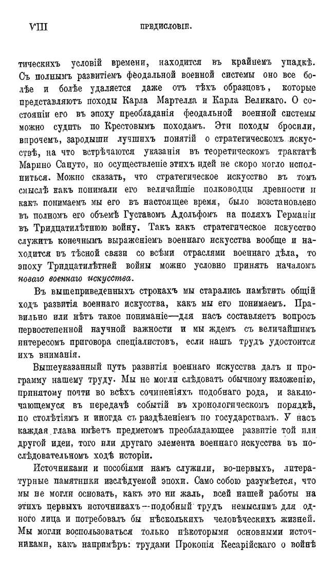 Изучение средневекового военного искусства необходимо не только для уяснения того пути, по которому развивалось военное дело, но и для полного точного понимания современных военных учреждений. Решая эту задачу, автор считает бесполезным излагать последовательно историю военного искусства у каждого народа и государства. Предметом исследования являются тот народ, то государство и те военные операции, которые наиболее полно выражают военное искусство данной эпохи.