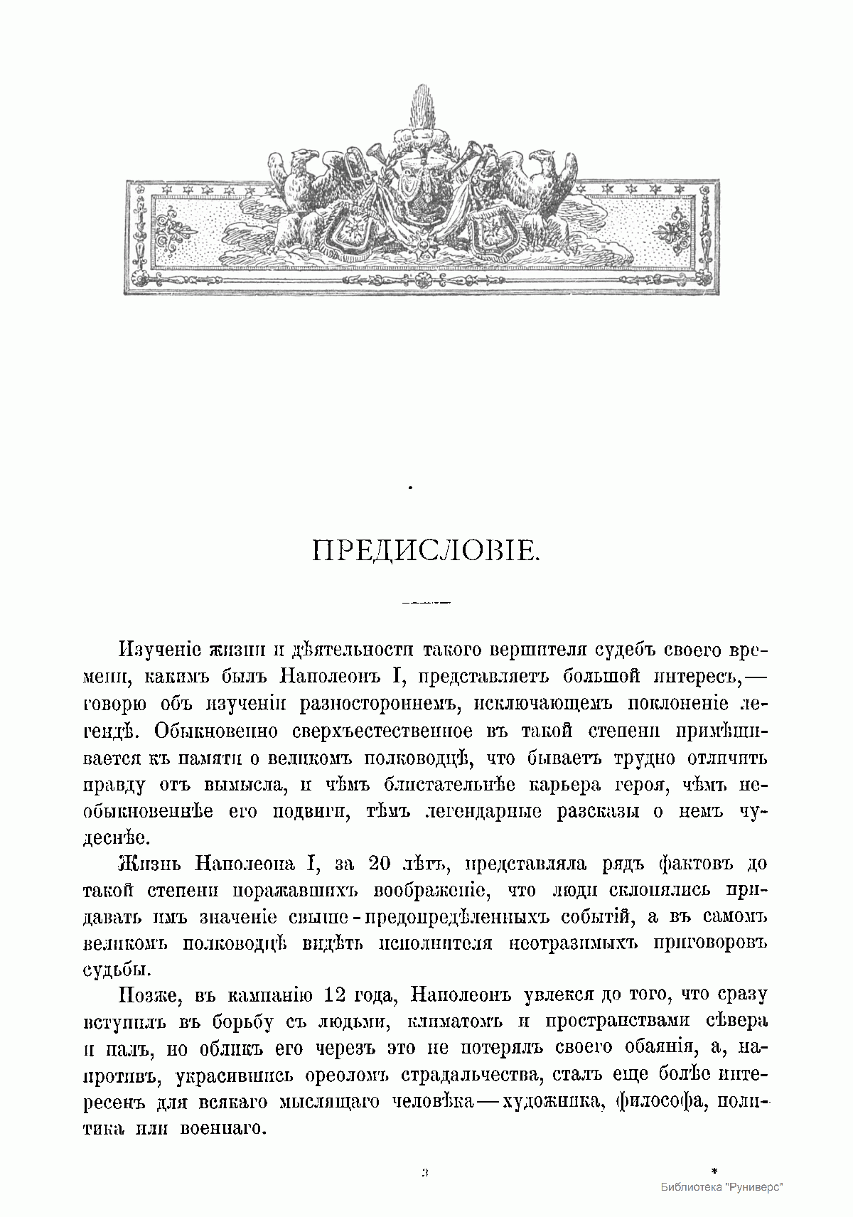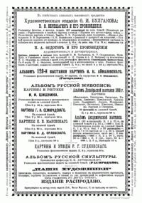 Это весьма занимательное популярное художественное издание представляет собой собрание 15 фотогравюр известных картин, принадлежащих кисти выдающегося российского баталиста и литератора В.В. Верещагина (1842–1904), рассказывающих о походе Наполеона и его «разноязыкой» армии в Россию в 1812 г. Эти картины фактически являются иллюстрациями к помещенным к ним кратким исследованиям-новеллам, подготовленным этим живописцем. Все новеллы написаны В.В. Верещагиным на основе детального изучения художником документальных и мемуарных источников эпохи войны 1812 г. Издателем книги являлся видный отечественный писатель и блестяще эрудированный искусствовед Федор Ильич Булгаков (1852–1908). Многие из изданных Ф. И. Булгаковым произведений стали знаковыми для своего времени и для последующих поколений. К числу этих художественных изданий с полным основанием можно отнести и «Художественную энциклопедию» (1886–1887), ставшую первым опытом всеобъемлющего справочника в русском и европейском искусствоведении.