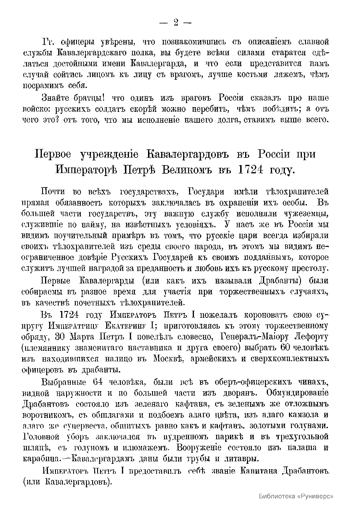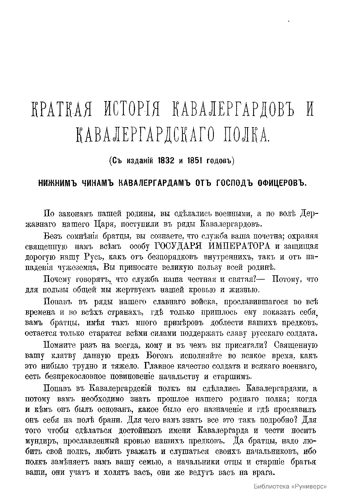 Краткая история Кавалергардского полка, созданного в 1724 г., была специально подготовлена «господами офицерами для нижних чинов» в связи с 50-летием зачисления государя императора Александра II в полк. Краткая брошюра представляет собой сокращенное изложение предыдущих исторических исследований истории этого полка, изданных в 1832 и 1851 гг. и уже размещенных в электронной библиотеке «РУНИВЕРС». Уникальность полка, помимо героических подвигов на полях сражений, заключалась в его церемониальной службе. Поэтому даже к нижним чинам предъявлялись очень жесткие требования, связанные не только с определенными физическими данными (рост и цвет волос), но и нравственными качествами. Полк многократно «удостаивался высочайших милостей и отличий» императорской семьи. Так, в 1826 г. Николай I назначил свою супругу – императрицу Александру Федоровну шефом полка. Это был первый пример назначения супруги императора шефом воинской части. А после кончины императрицы в октябре 1860 г. император Александр II принял звание шефа полка на себя.