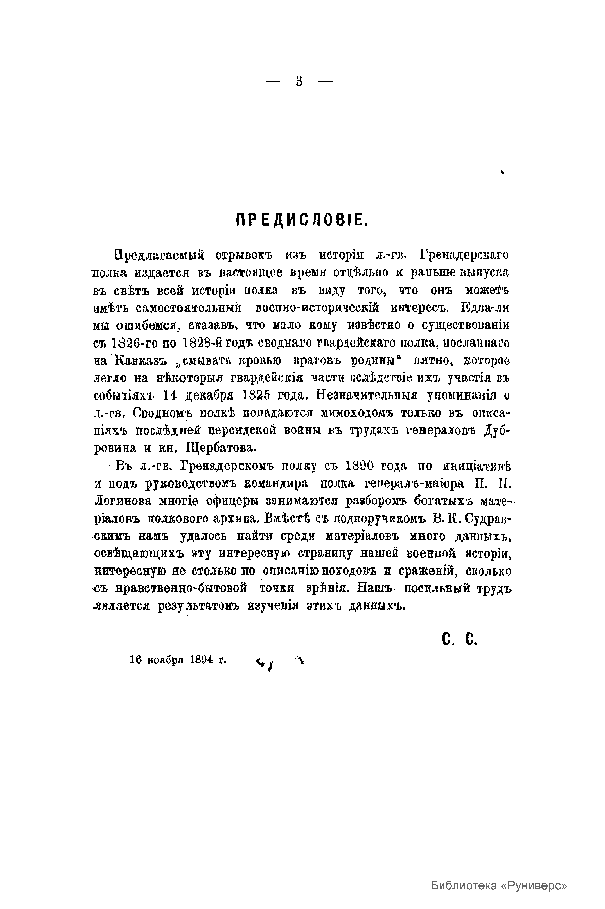 Представленный военно-исторический очерк был подготовлен поручиком полка С. Э. Скрутковским в рамках разработки капитального юбилейного труда, посвященного 150-летию со времени создания полка, первый том которого впоследствии (в 1906 г.) выпущенного офицером полка В.К. Судравским. 30 марта 1756 года императрица Елизавета подписала представление о сформировании в пехоте четырех новых гренадерских полков, 1-й гренадерский полк, создание которого было поручено графу П. А Румянцеву, составили третьи гренадерские роты из нескольких пехотных полков, полковой праздник был назначен 18 декабря – в день рождения основательницы полка – Елизаветы Петровны. В апреле 1813 г. за мужество и храбрость, проявленные в Отечественную войну, полк был причислен к составу молодой гвардии и назван лейб-гвардии Гренадерским с преимуществом обер-офицеров против армейских полков в один чин (в отличие от старых гвардейских полков, где было преимущество в два чина). 20-е годы XIX столетия стали временем революционного брожения в русской армии. Не остались в стороне от декабристского движения и лейб-гвардии гренадеры. 14 декабря 1825 г. часть 2-го батальона выступила во главе с двумя офицерами и примкнула к восставшим на Сенатской площади. После разгрома восстания декабристов, уцелевшие его участники были арестованы, а затем направлены на Кавказ. С этой целью в 1826 г. был специально сформирован сводный гвардейский полк под командованием полковника-преображенца И.П. Шипова 2-го. Воины этого полка должны были «смыть с себя кровью врагов родины» пятно позора, которое легло на некоторые гвардейские части, прежде всего, нижние чины лейб-гвардии Гренадерского и лейб-гвардии Московского полков, за свою вовлеченность в декабристское выступление. Летом 1826 г. сводный полк полковника Шипова прибыл через Каспий к театру военных действий. Здесь гренадеры приняли участие в отражении значительно превышавший по численности авангард иранской армии, направлявшийся к Тифлису, а затем в составе Отдельного кавказского корпуса под командованием генерала И.Ф. Паскевича осенью 1826 г. отбросили войска иранского шаха за р. Аракс. В ходе весенне-летней кампании 1827 г. батальоны сводного гвардейского полка разгромили иранские войска Аббас-Мирзы в Армянской области и, пройдя с боями от Нахичевани, в октябре 1827 г. вступили в Эривань, ставший столицей Армении, вошедшей по условиям Туркманчайского мира 1828 г. в состав Российской империи, а затем продвигались к Тавризу (Тебризу). Личный состав двух гренадерских батальонов и особенно их офицерский состав особо отличился при осаде иранской крепости Аббас-Абада. В очерке в качестве приложения опубликован список офицеров сводного полка за 1826-1828 гг. с указанием их награждений за участие в боевых действиях.