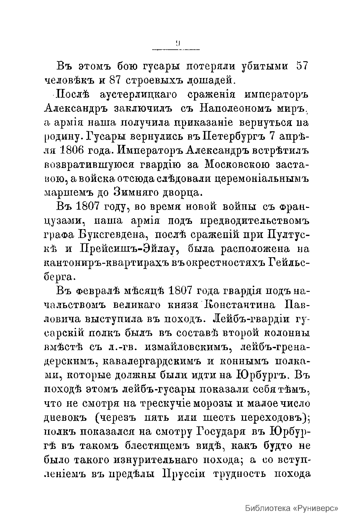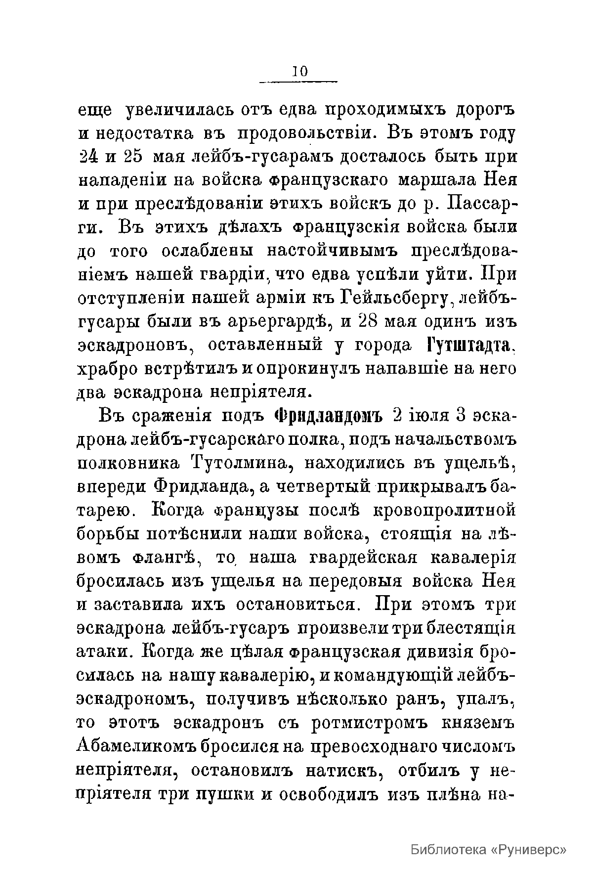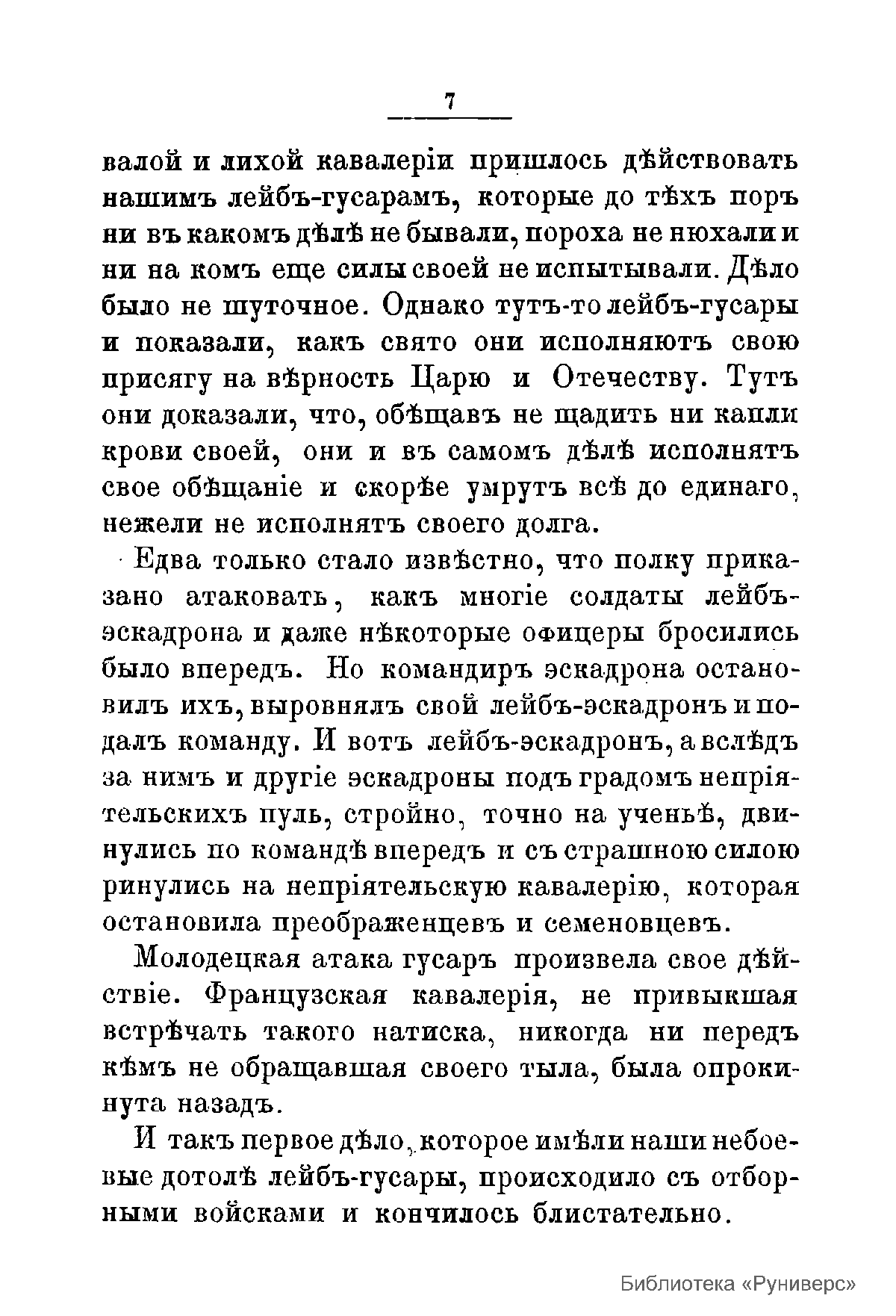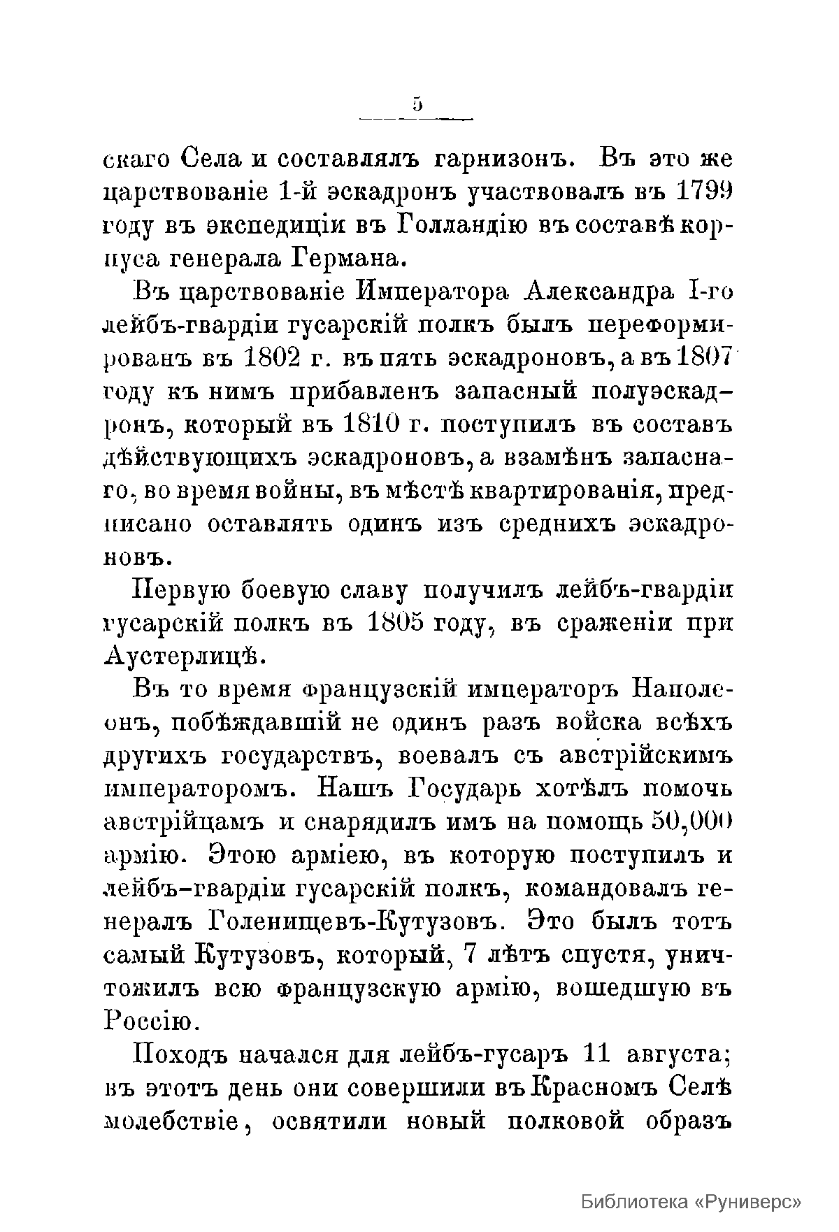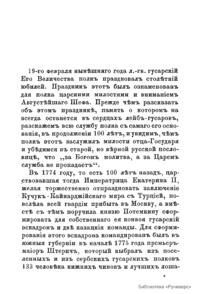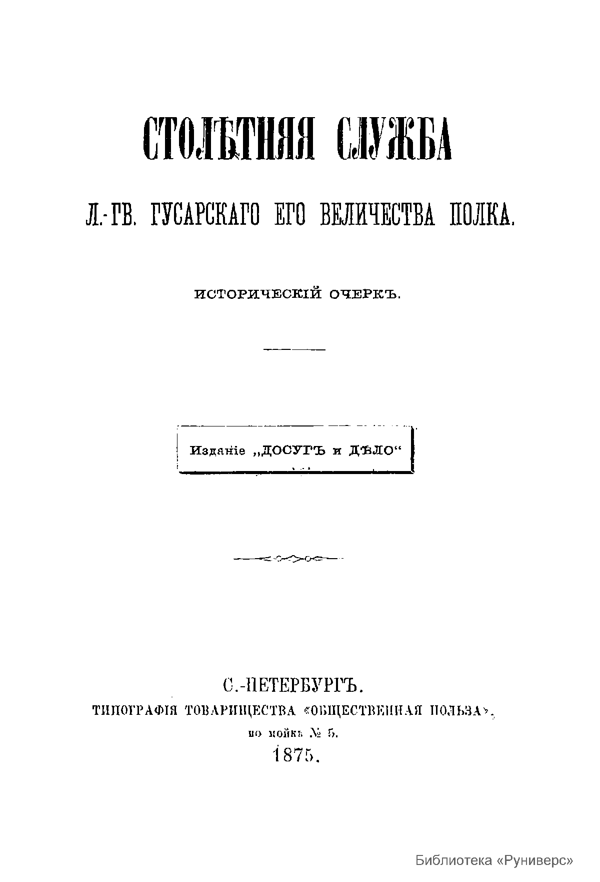Исторический очерк, изданный в 1875 г. к 100-летнему юбилею Лейб-гвардии Гусарского Его Величества полка (1775 – 1918 гг.). В нем излагается история полка: участие в Наполеоновских войнах, русско-турецкой войне 1828 – 1829 гг. и русско-польской войне 1830 – 1831 гг., отмечаются подвиги лейб-гусар и перечисляются полковые знаки отличия. Очерк издан обществом «Общественная Польза» и предназначен «для чтения солдат и народа».