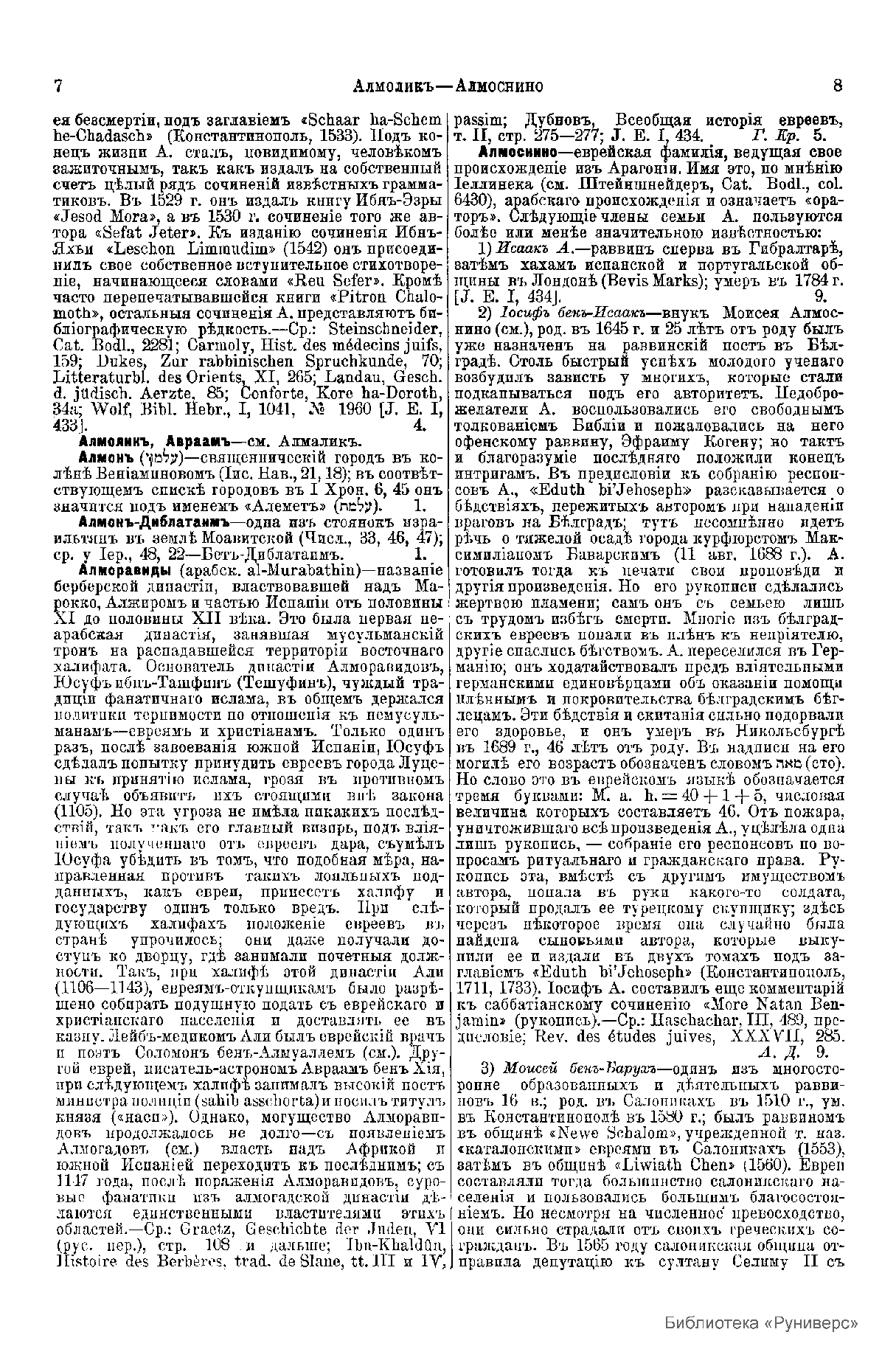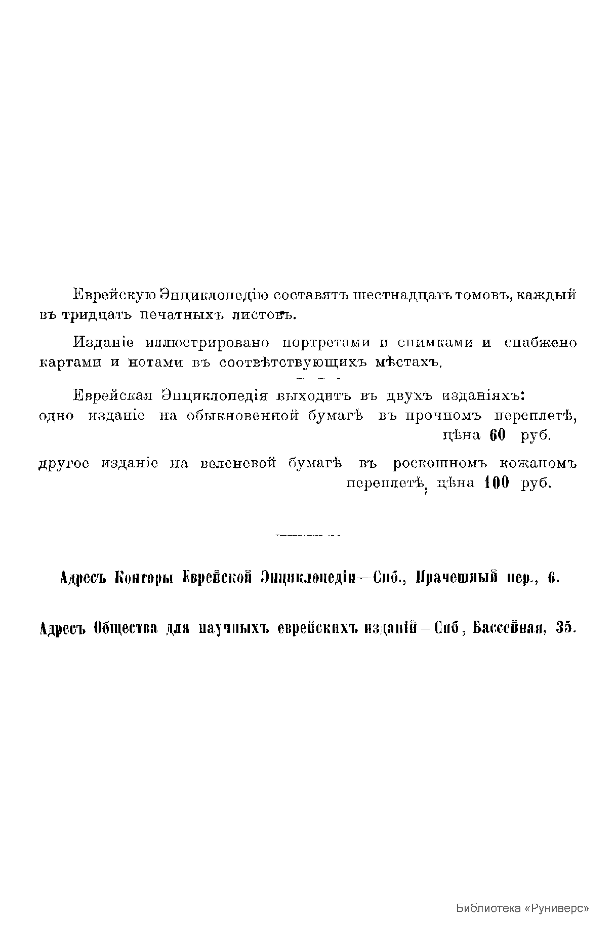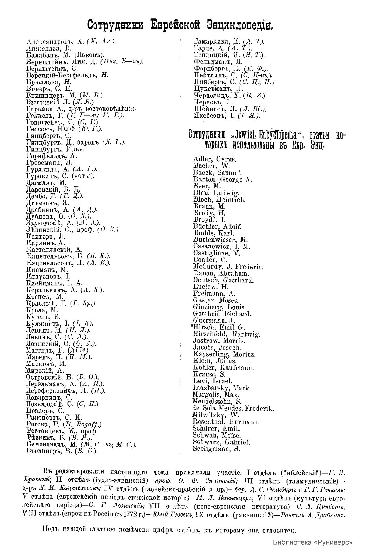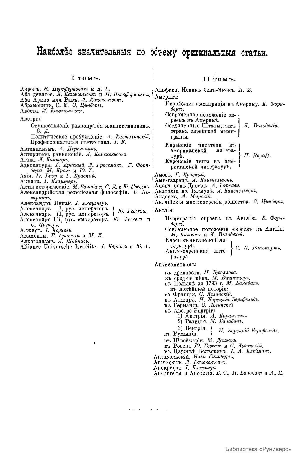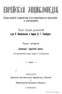 Первый крупный энциклопедический свод знаний о еврействе на русском языке. Энциклопедия была опубликована в 1908 – 1913 гг. в шестнадцати томах в Санкт-Петербурге «Обществом для научных еврейских изданий» и «Издательством Брокгауз – Ефрон». Основой и образцом для нее послужила вышедшая несколько годами ранее двенадцатитомная «The Jewish Encyclopedia» (London; New York, 1901 – 1906). Однако ее материал был существенно дополнен и расширен авторами «Еврейской Энциклопедии Брокгауза» во всем, что касалось истории, культуры и современного положения еврейских общин в Восточной Европе. В работе над «Еврейской энциклопедией Брокгауза» принимали участие виднейшие представители российской иудаики, гебраистики и востоковедения: А.Гаркави, Д. Гинцбург, Ю Гессен, С. Дубнов, И. Маркон, Н. Переферкович. «Еврейская энциклопедия Брокгауза» до сих пор остается одним из важнейших источников справочной информации и статистических данных о почти шестимиллионном еврейском населении Российской империи начала XX в. И потому ее данные можно отнести к числу ценных источников сведений по социально-политической, этнической, культурно-религиозной истории и исторической демографии России и сопредельных ей стран.