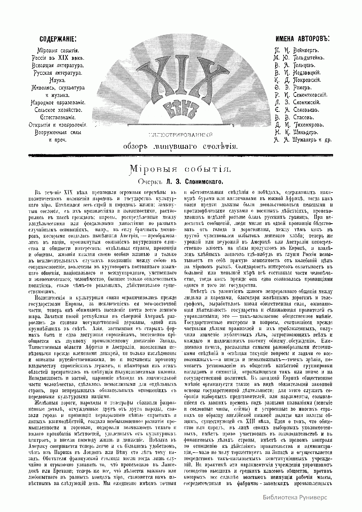 Есть среди россиян старинный обычай: при праздновании Нового года уделять внимание году минувшему. Вспоминаются славные дела, друзья, разделенные расстоянием, необычные происшествия года, и многое другое, чего так сразу и не перечислишь… Но в книжном мире, где существуют свои традиции, решили это событие отметить по-своему – выпуском специального иллюстрированного приложения «XIX век» к журналу «Нива», в котором был дан обзор примечательных дат минувшего столетия. Здесь можно прочесть материалы о мировых событиях во многих разделах культуры прошедшего века, которые сегодня смотрятся совсем иначе, оценить по достоинству профессионального мастерство литераторов и ученых, авторов сборника. Литераторов теперь уже позапрошлого века.