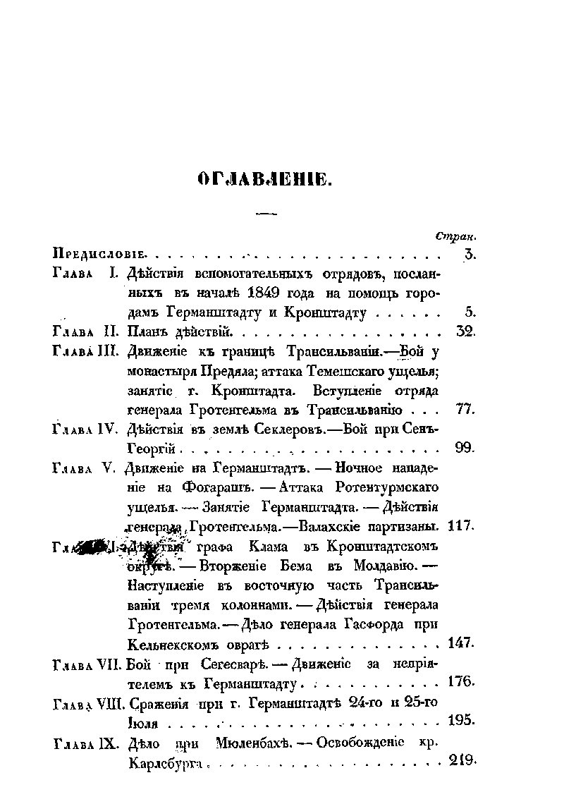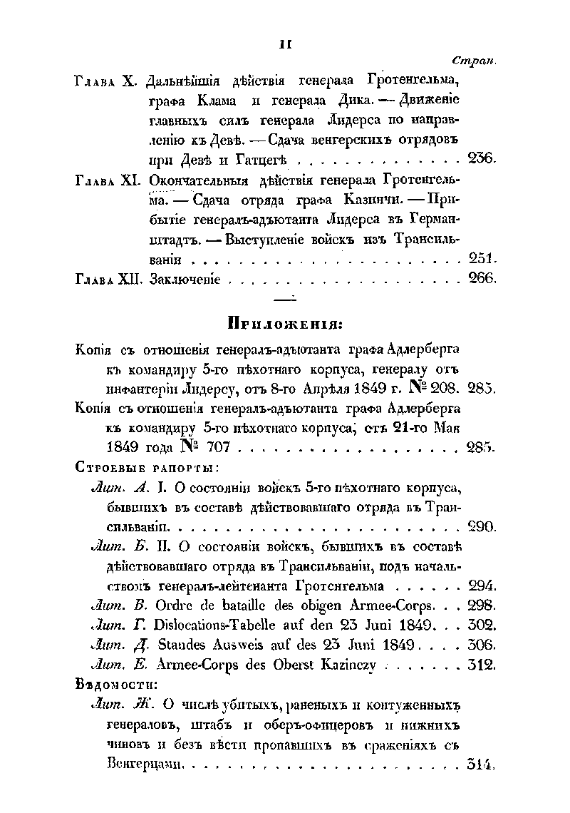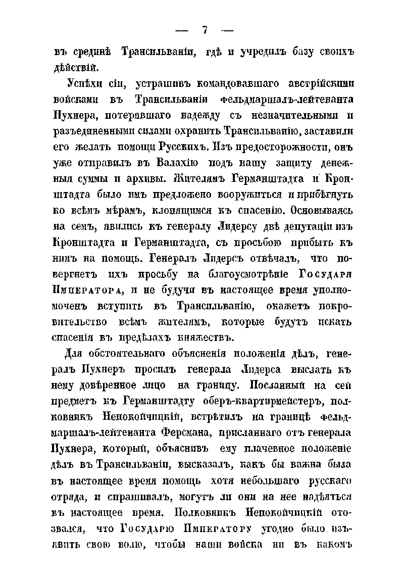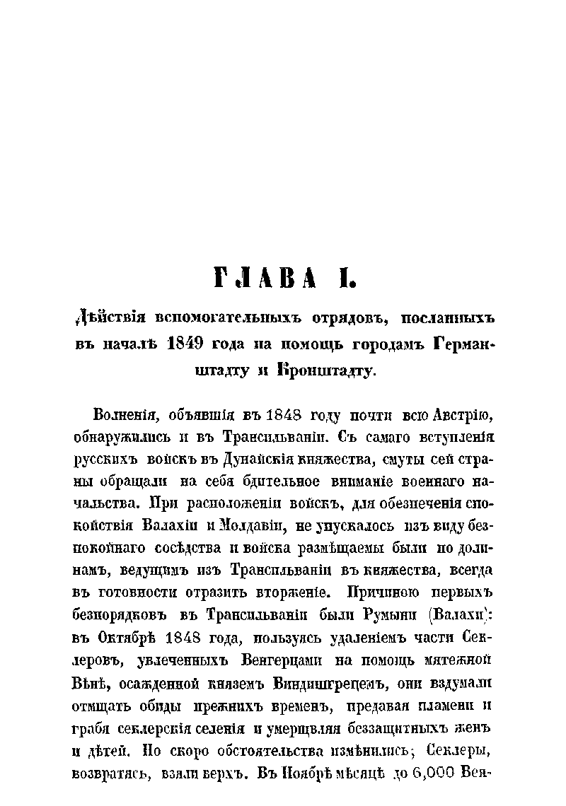 Издание содержит подробное изложение хода весьма успешных боевых действий русских экспедиционных войск в составе 5-го пехотного корпуса генерала от инфантерии А.Н. Лидерса, в военной кампании против венгерской повстанческой армии Ю. Бема в Трансильвании летом 1849 г. Автором этого военно-исторического труда является известный военный деятель российской армии николаевской эпохи генерал А.А. Непокойчицкий, который принимал непосредственное участие в походе в Трансильванию, занимая должность начальника штаба отряда корпуса. Данную работу А.А. Непокойчицкий написал сразу же по завершении военной кампании, в 1851 г. Однако, начало Крымской войны 1853-1856 гг. помешало изданию этой книги. Автор подробно описывает выступление частей 5-го корпуса из Бухареста, бой у монастыря Предял и взятие укрепленной позиции повстанцев у Кронштадта (Брашова). Затем части корпуса участвовали в преследовании противника к г. Сфынтул-Георге, боях при взятии укреплений в Темешском и Ротенбургском ущельях, занятии Германштадта (Сибиу), сражениях при Сегешваре (Сигишоаре) и у Мюльбаха (Себеш) и, наконец, в занятии г. Дева и принятии сдачи отрядов Беккера и Фрумера у Сасварошу (Орэштие). В качестве приложений публикуются ведомости численности русских войск, принимавших участие в походе в Трансильванию, а также общая численность потерь личного состава корпуса в ходе этой кампании. Помимо этого приведены данные о численности войск австрийских союзников – их боевое расписание на немецком языке.