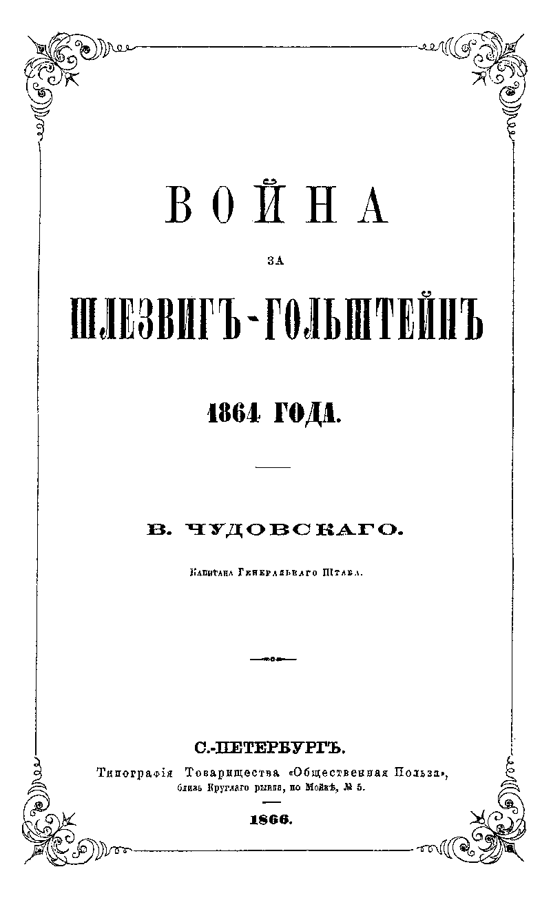 Монография капитана Генерального Штаба В.Н. Чудовского о событиях войны Пруссии против Дании, за обладание связанными личной унией с Данией герцогствами Шлезвигом и Гольштейном в 1864 г., подготовленная по свежим впечатлениям, до сих пор является важнейшим военно-историографическим исследованием по данной теме.