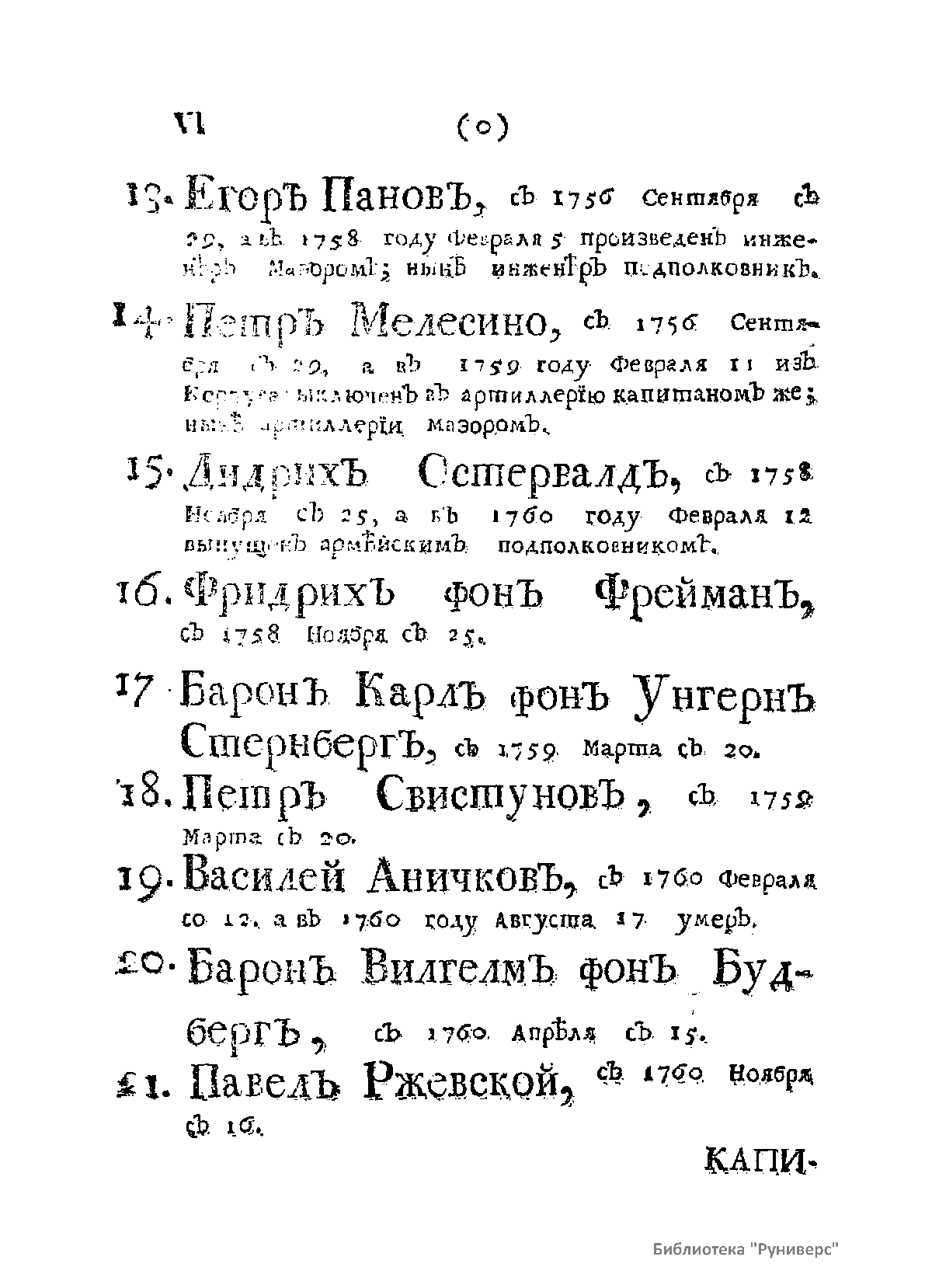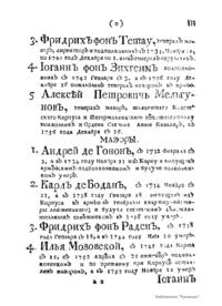 Список живущих и умерших на 1761 г. штаб- и обер-офицеров – руководителей, преподавателей и выпускников Сухопутного Шляхетского кадетского корпуса, а также обучающихся в тот период кадетов Корпуса с краткими личными характеристиками каждого. Список составлен и издан по приказу великого князя Петра Федоровича (будущего императора Петра III).