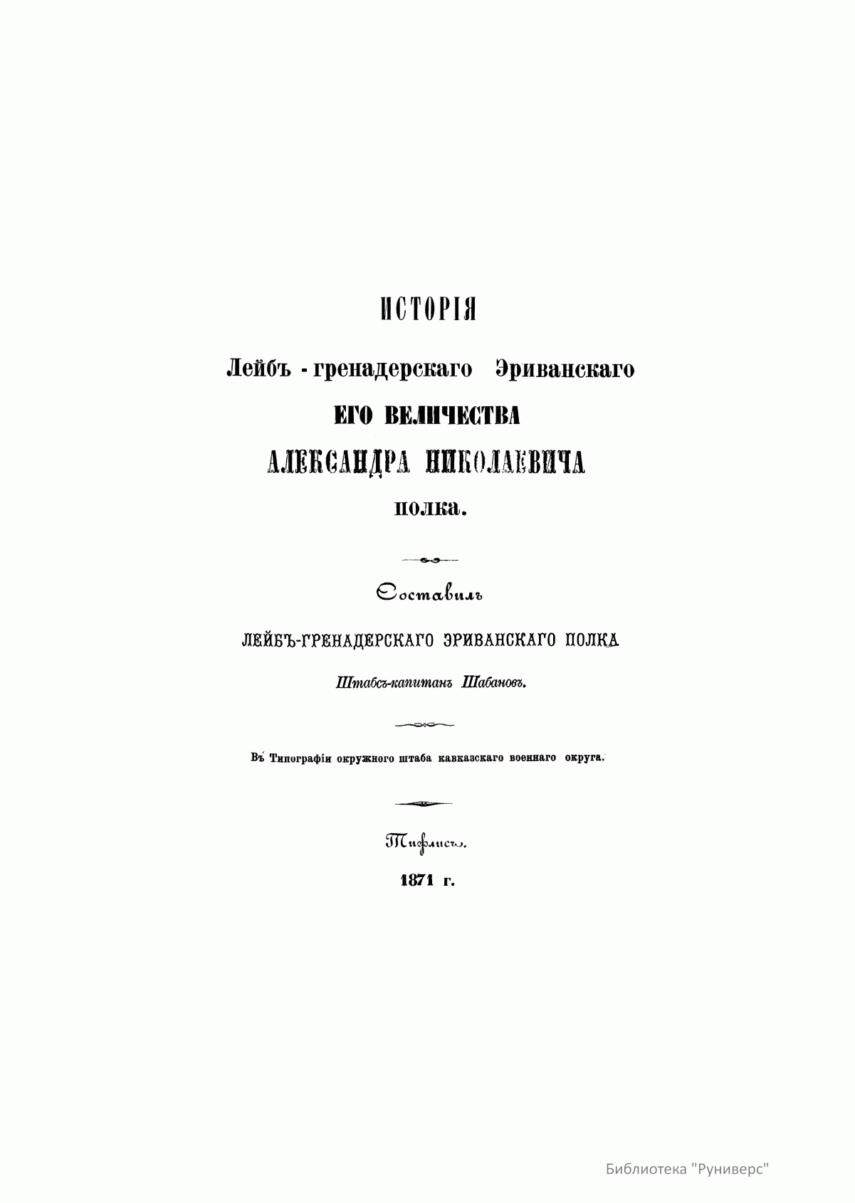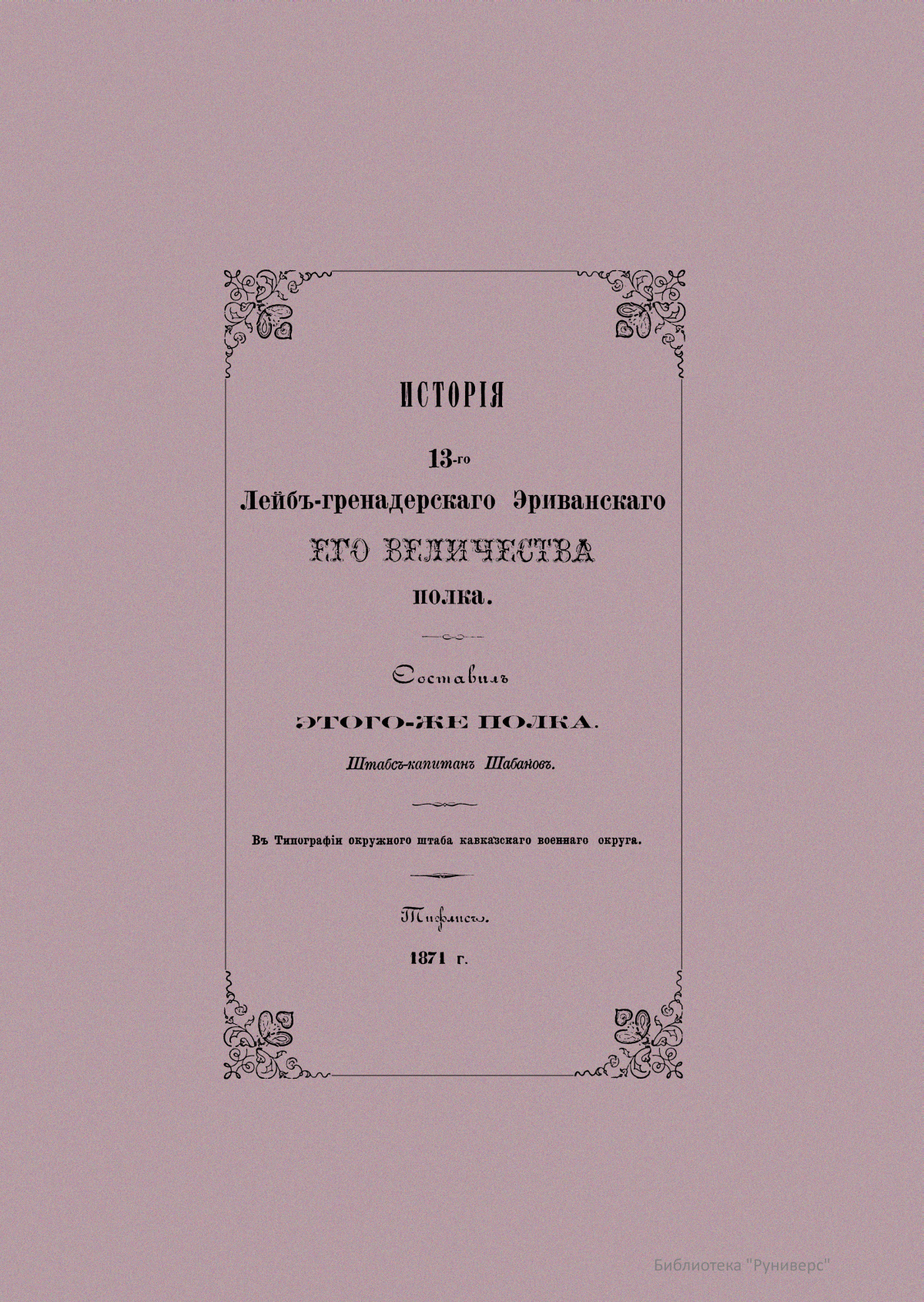Эриванский 13-й лейб-гренадерский полк — старейший и наиболее титулованный полк русской армии. История полка началась в 1642 г., когда по указу царя Михаила Федоровича был сформирован Московский выборный солдатский Бутырский полк из числа московских стрельцов. Полк веками достигал своей боевой славы на полях битвы за родное отечество. Первым летописцем истории полка стал штабс-капитан этого полка Дмитрий Федорович Шабанов. Для подготовки данного издания автор использовал материалы архивов главного кавказского штаба, канцелярии кавказского наместника, а также полкового архива, хранившего текущую переписку с 1811 г. Боевые действия и события внутренней жизни полка изложены в хронологическом порядке. В повествовании название полка сохранено то, под каким он действовал в течение описываемой эпохи.