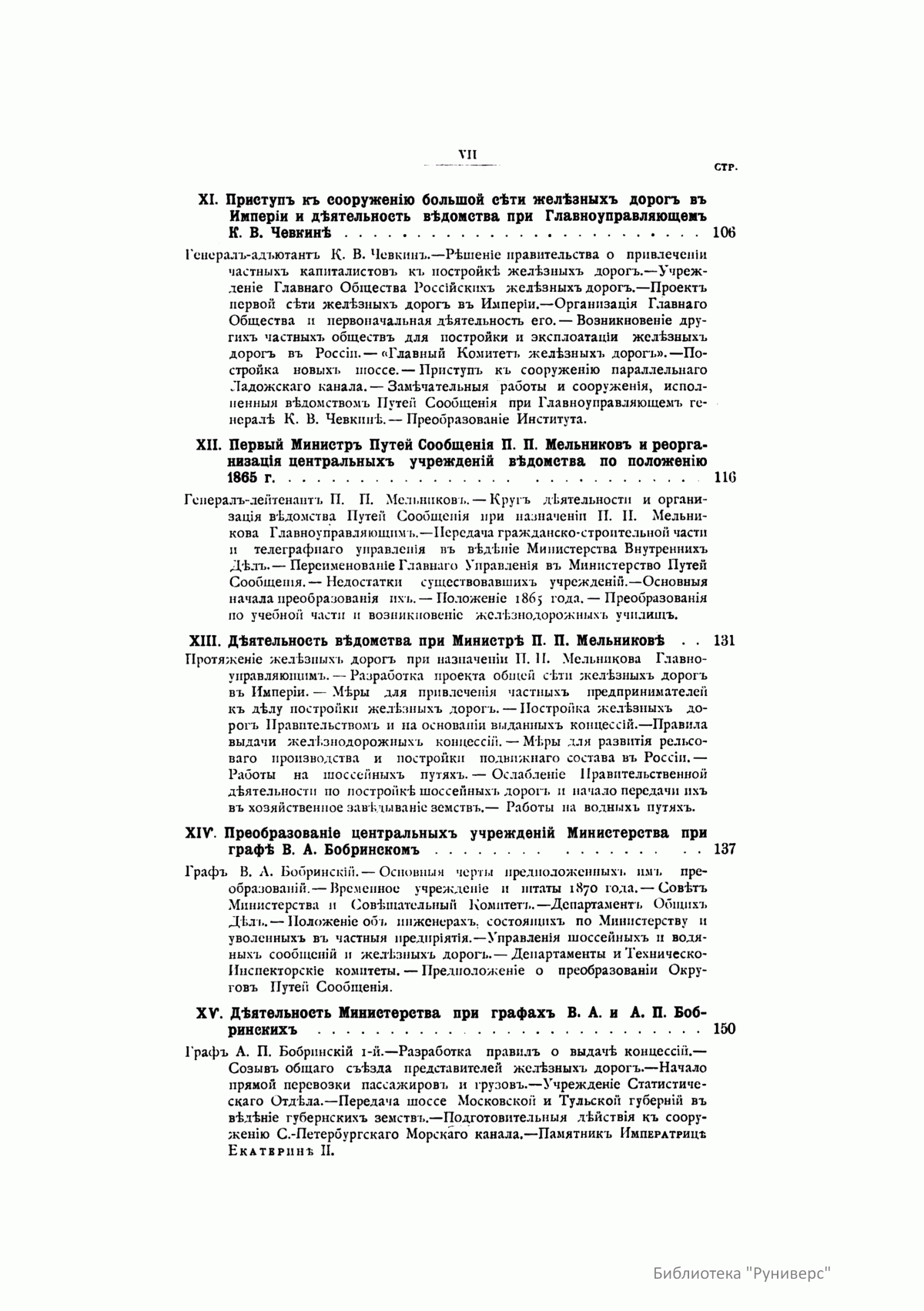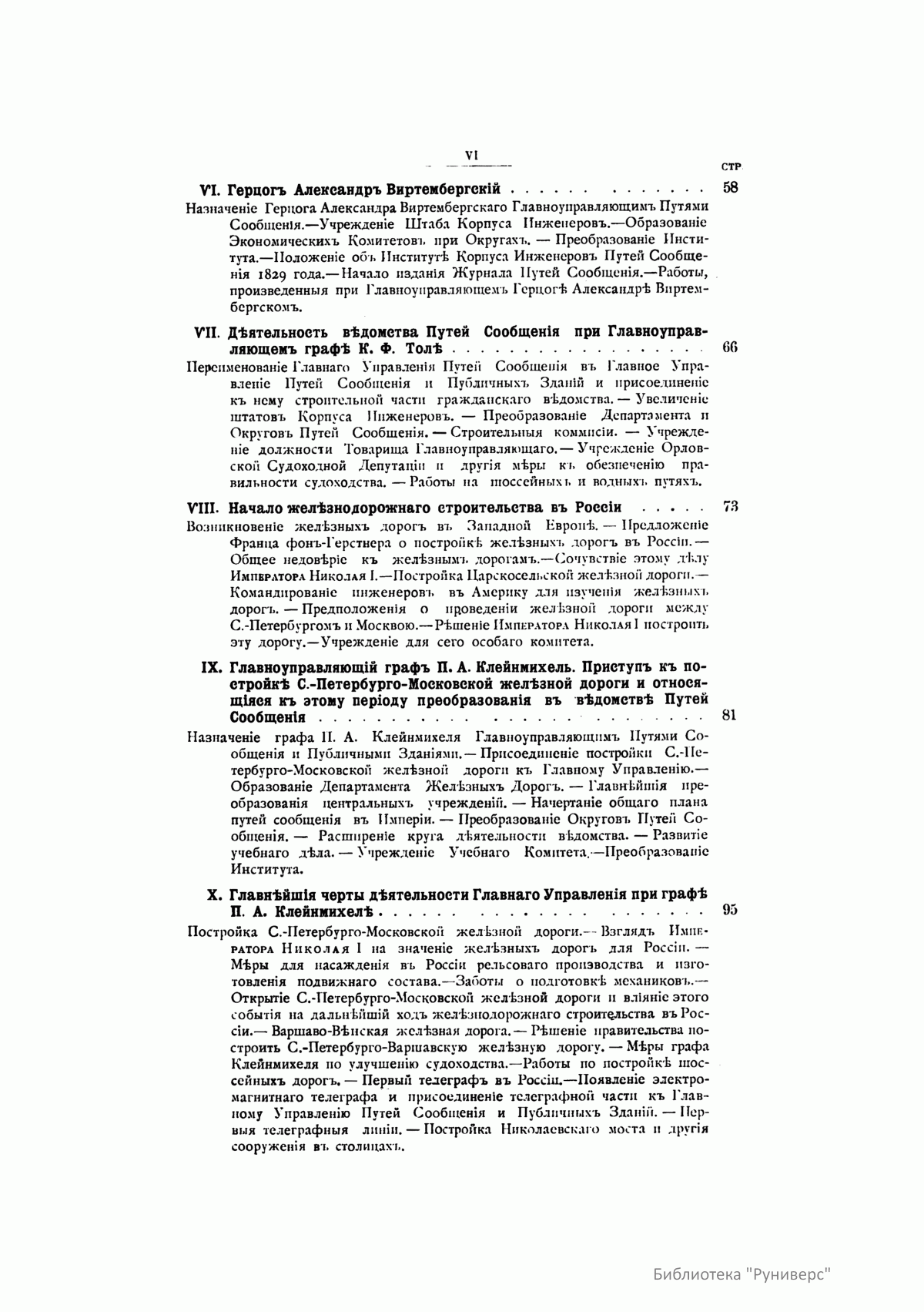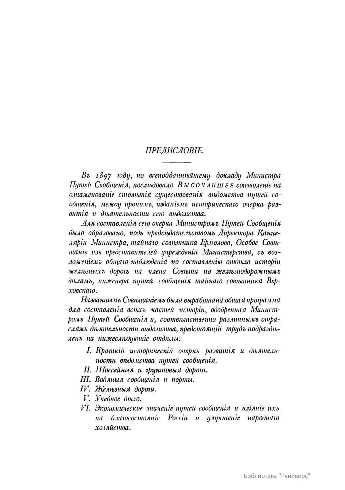 «Краткий исторический очерк развития и деятельности Ведомства путей сообщения за сто лет его существования» повествует о строительстве в России шоссейных, грунтовых и железных дорог, налаживании водных сообщений и строительстве портов, учреждении инженерных и железнодорожных училищ, институтов путей сообщения. Рассматривается вопрос влияния путей сообщения на благосостояние России, рассказывается о преобразованиях в самом ведомстве и его руководителях. Источниками для книги послужили архивные документы Министерства путей сообщения, «Полное собрание законов Российской империи», «История России с древнейших времен» С. Соловьева и др. Издание содержит список высших чинов Ведомства путей сообщения с 1797 по 1898 г., их портреты и портреты императоров. Шесть отдельных листов цветных карт наглядно иллюстрируют, сколько было в разные годы сооружено железных и шоссейных дорог, судоходных каналов. Карты составлены начальником статистического отдела министерства генерал-лейтенантом И. Ф. Борковским. Работой над созданием очерка руководил директор канцелярии Министерства путей сообщения тайный советник А. С. Ермолов.