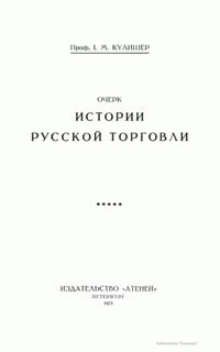 Научный труд профессора И. М. Кулишера «Очерк истории русской торговли» вышел в 1923 г. в Петербурге в издательстве «Атеней». В книге подробно исследуется развитие торговли в России с древнейших времен до начала XX столетия. Автор использовал литературу по русской истории, истории права и истории торговли, многочисленные отечественные и иностранные источники. Ссылаясь на собственные «Лекции по истории экономического быта Западной Европы» шестого издания, он проводил параллели между развитием русской торговли и торговли в иностранных государствах. Все сочинение разбито на соответствующие эпохи. Ученый за начало исследования взял VIII век — время появления на Руси куфических монет, завершается труд разбором договоров и трактатов внешней торговли конца XIX – начала XX века.