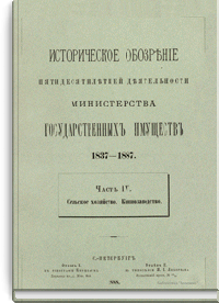 Министерство государственных имуществ возникло в 1837 г. по воле императора Николая I. Главная задача министерства заключалась в установлении попечительства над государственными крестьянами и лучшее устройство государственного имущества, то есть казенных земель и лесов, которые с 1811 г. вместе с казенными крестьянами состояли в ведении министерства финансов по департаменту государственных имуществ. Под влиянием неурожаев начала 30-х годов министерству было поручено также заведывание всеми делами, относящимися к усовершенствованию сельского хозяйства. В 1874 г. из министерства финансов министерству государственных имуществ передано горное дело. В ведении этого министерства два раза, с 1848-го по 1856-й и с1874-го по 1881 гг., находилось государственное коннозаводство. «Историческое обозрение пятидесятилетней деятельности Министерства государственных имуществ» (1837 – 1887) знакомит читателя с главными результатами деятельности этой организации. «Обозрение» разделено на пять частей. Первая часть посвящена учреждению Министерства государственных имуществ и преобразованиям, которым оно подвергалось с 1837-го до 1887 г. Вторая часть состоит из двух отделов: в первом излагаются главные результаты попечительства министерства над свободными сельскими жителями, во втором – результаты поземельного устройства государственных крестьян. Третья часть также разделена на два отдела: в первом излагаются результаты управления казенными землями и оброчными статьями, во втором – результаты управления казенными лесами. Четвертая часть также включает два отдела: первый отдел посвящен результатам заведования министерством сельскохозяйственной частью, второй – управлению государственным коннозаводством. В пятой части излагаются результаты заведывания горным делом. Главными материалами для «Обозрения» кроме текущих и архивных дел министерства послужили всеподданнейшие отчеты министров государственных имуществ, а также некоторые печатные источники.