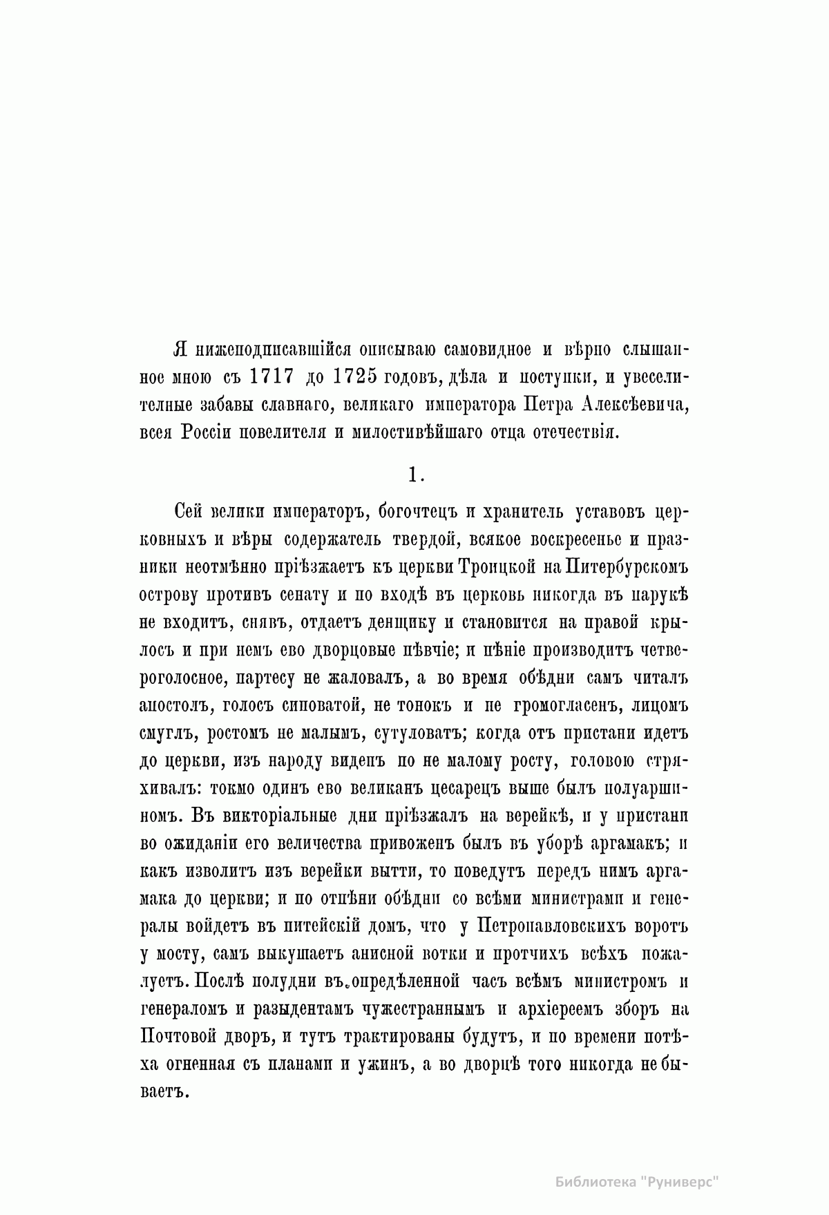 «Сочинитель сей рукописи Никита Иванович Кашин служил при Петре Великом солдатом и умер в сержантском чине. Любя чтение, он записывал все то, что видел и слышал о великом современнике своем. Рукопись свою присовокупил он к печатной книге, изданной в 1764 году в двух частях, о Петре Первом. Книги и рукописи достались по наследству его сыну, от которого переходили в разные руки». С.Н. Глинка В настоящем издании рукопись Кашина опубликована полностью. В нее входят следующие рассказы: 1. О церемонии приезда Петра Великого в праздничные дни в церковь св. Троицы на Петербургской стороне, с описанием наружности царя. 2. Об образе жизни Петра. 3. Об одежде Петра и неудовольствии его, если кто при встрече с ним на улице, кланяясь ему, останавливался. 4. О заступничестве генерал-адмирала Ф.М. Апраксина за малолетних детей дворянских, отправленных по распоряжению царя бить сваи на Мойке. 5. Об ассамблеях. 6. О славленье на святках. 7. О свадьбе князь-папы Петра Ивановича Бутурлина. 8. О раздаче судов разным лицам для обучения их навигации. 9. О некоторых привычках Петра Великого и об отвращении его от тараканов. 10.-11. Сравнение дел Петра Великого с делами его отца. 12. О фейерверке и иллюминации в Петербурге и Москве по случаю заключения Ништадского мира. 13. О походе в Персию. 14. О чудотворной иконе Казанской Божией Матери, о Феодосии Яновском и Стефане Яворском. 15. О болезни, смерти и погребении Петра Великого.
