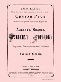Небольшой альбом, который прилагался к книге Святая Русь, знакомит читателя с картинами некоторых событий русской истории и видами русских городов. Здесь представлены следующие события: Убиение Аскольда и Дира Олегом. Воззвание Минина к народу в 1611 г. Князь Пожарский, 1610 г. Восстание Москвы на самозванца Лжедмитрия под предводительством Шуйского. Осада Троице-Сергиевой лавры поляками, 1608 г. Кровопролитная битва на Куликовом поле. Битва с шведской эскадрой у Гангута, 1714 г. Гибель шведской армии в 1709 г. Памятник Полтавской битвы. В альбоме представлены следующие города и монастыри: Кременец Волынской губернии, Вильна, Витебск, Архангельск, общий вид Соловецкого монастыря, Мезень Архангельской губернии, Вологда, Спасо-Суморин монастырь в г. Тотьме Вологодской губернии, Великий Устюг Вологодской губернии, Петрозаводск Олонецкой губернии, Новгород, Старая Русса Новгородской губернии, главная улица Миллионная в Твери, Торжок Тверской губернии, Калязин Тверской губернии, Старица Тверской губернии, Иваново-Вознесенск Владимирской губернии, Ярославль, церковь Иоанна Предтечи в Толчкове в г. Ярославле, Рыбинск Ярославской губернии, Углич Ярославской губернии, Пошехонье Ярославской губернии, Тула, Белев Тульской губернии, Ливна Орловской губернии, Чистополь Казанской губернии, Царицын Саратовской губернии, Чугуев Харьковской губернии, Кишинев Бессарабской губернии, Екатеринослав, Новочеркасск, Старочеркасск, Одесса Херсонской губернии, Севастополь Таврической губернии, Тифлис, Эривани, Иркутск.