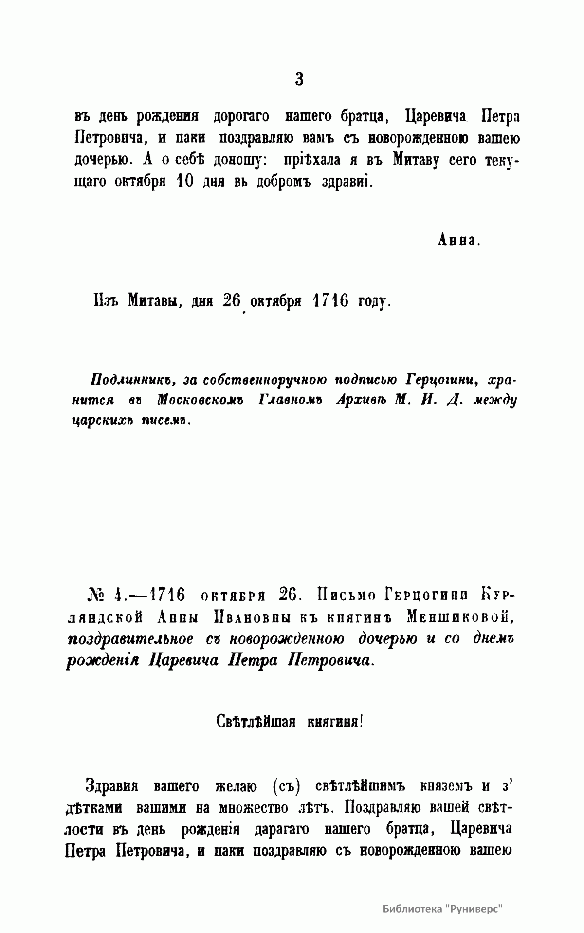Письма русских государей и других особ царского семейства. IV. Переписка Герцогини Курляндской Анны Ивановны
