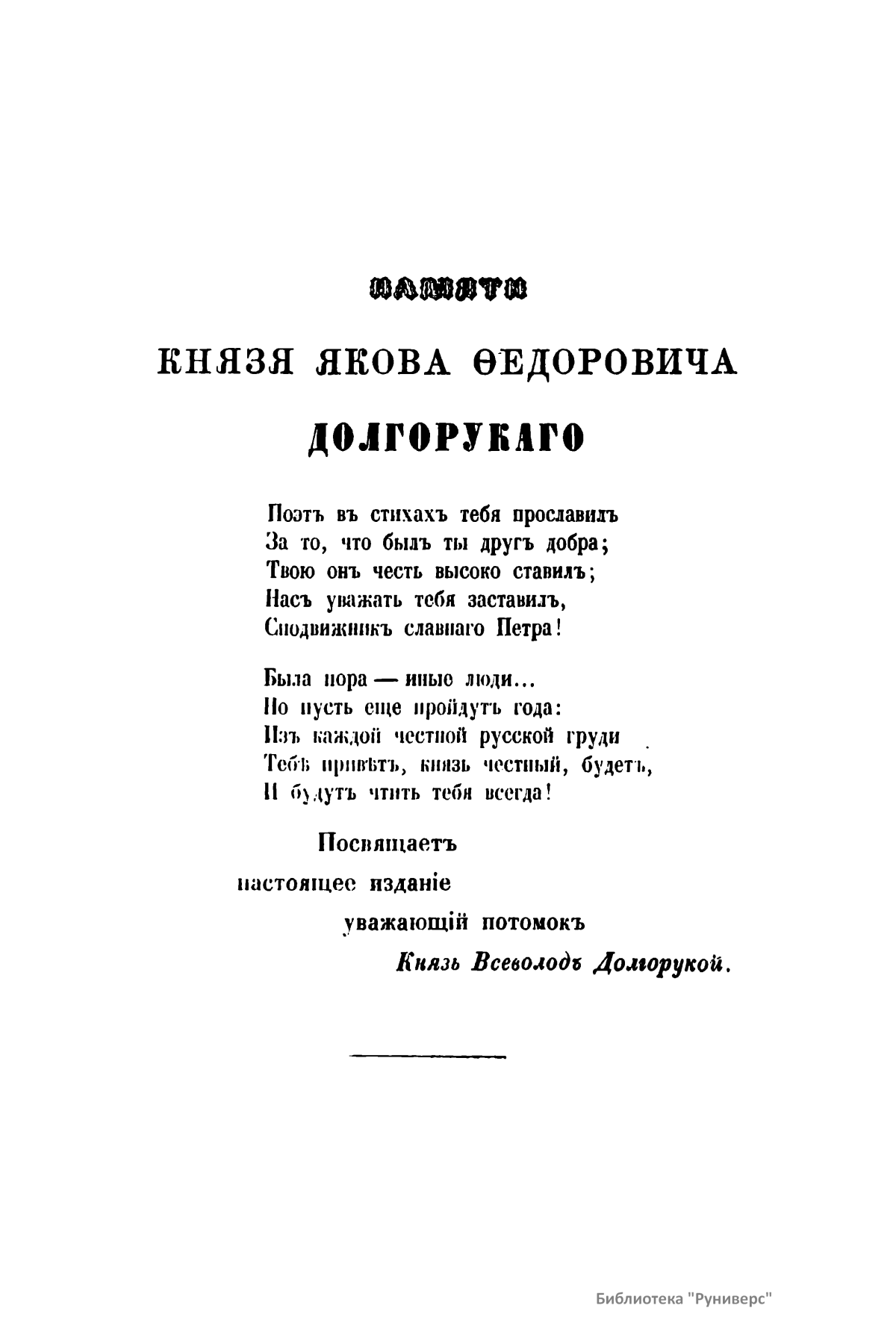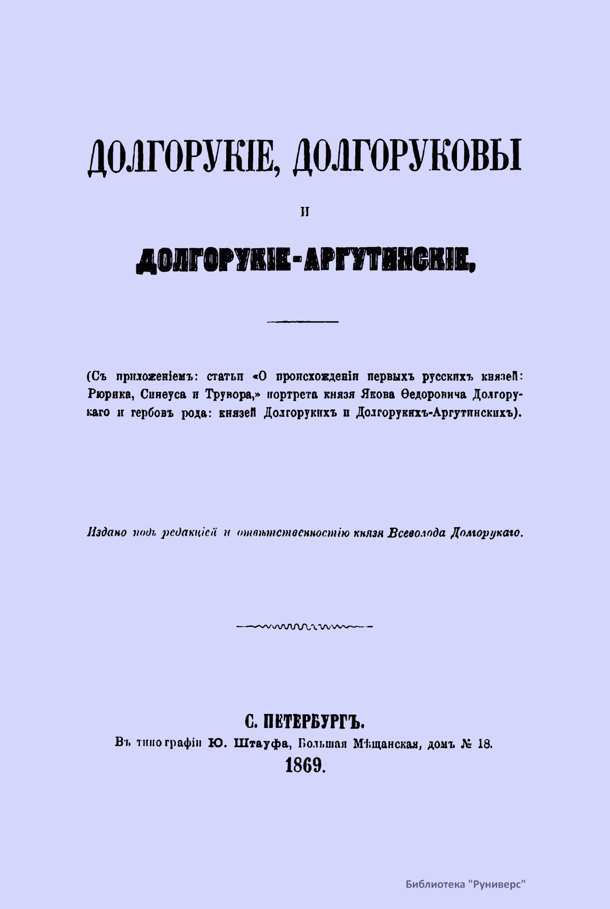 В библиотеке «Руниверс» представлена первая часть книги «Долгорукие, Долгоруковы и Долгорукие-Аргутинские». Цель этой части – познакомить читателя с родом князей Долгоруких. Издатель книги, князь Всеволод Долгорукой, представляет не строгое научное исследование, а рассказ о первой линии князей Долгоруких, но основанный на исторических данных. Настоящее сочинение имеет цель также опровергнуть мнение князя Петра Владимирович Долгорукова о том, что фамилию нужно писать через «ов», а не через «ой». Первая часть книги – сочинение князя Алексея Долгорукого и Натальи Шпилевской, заключает главы: О роде. Из дела о гербе и подписи Долгоруких. История рода Долгоруких. В «Приложении» представлен список старшей линии князей Долгоруких; список дочерей князей первой линии; список супруг князей Долгоруких старшей (первой) линии. Первую часть заключает статья князя Алексея Долгорукого «Заметки о первых русских князьях и о происхождении Рюрика, Синеуса и Трувора».