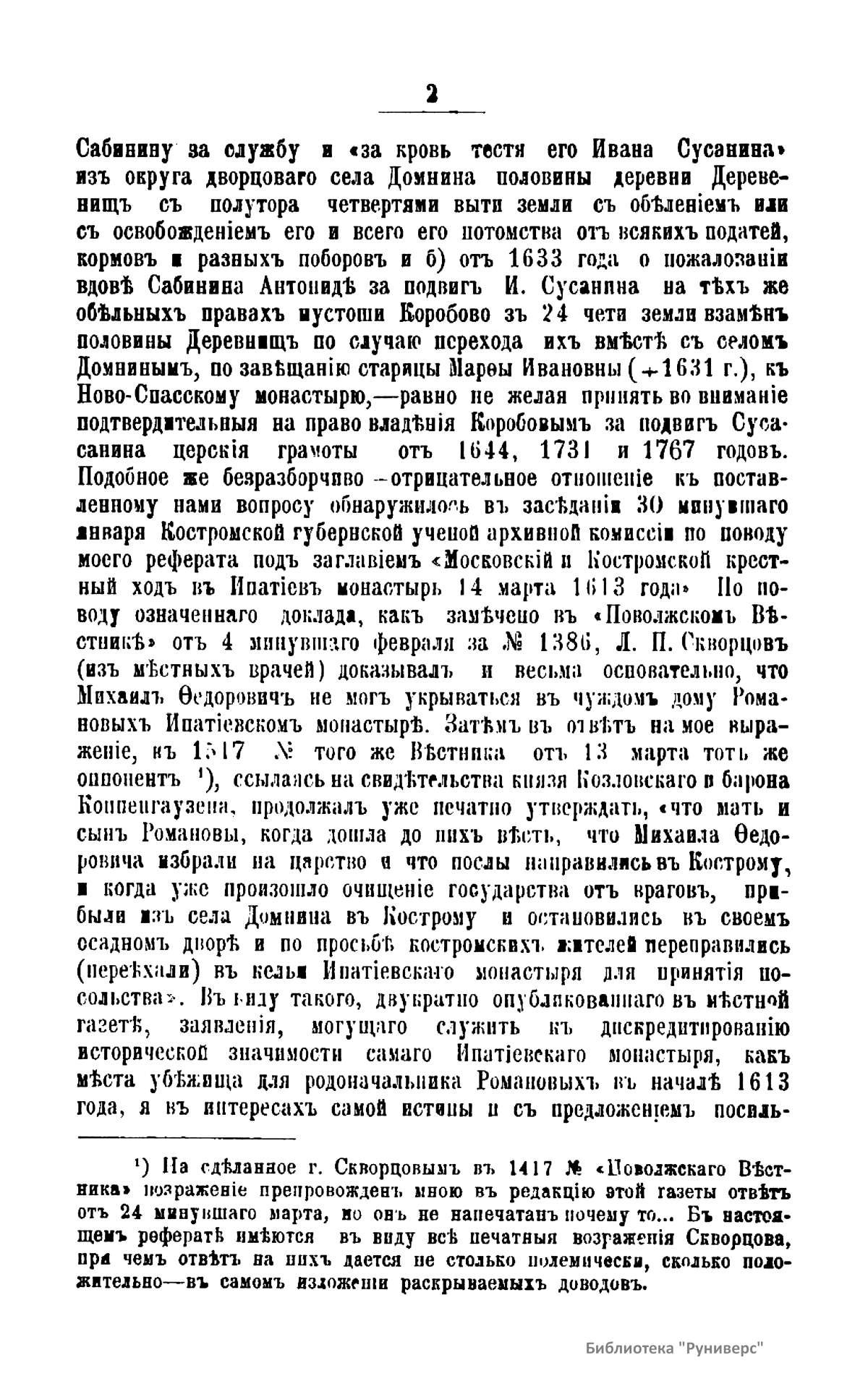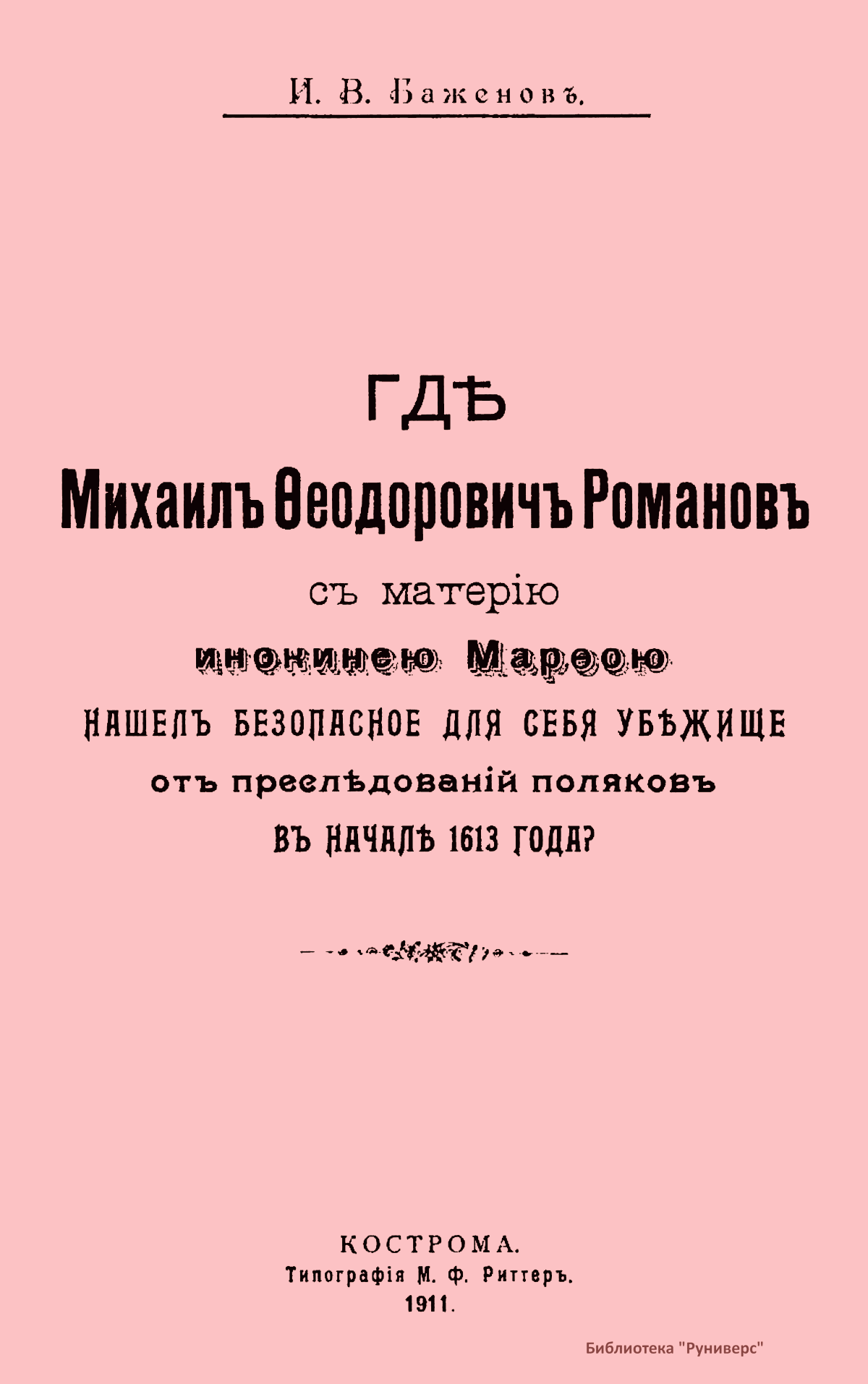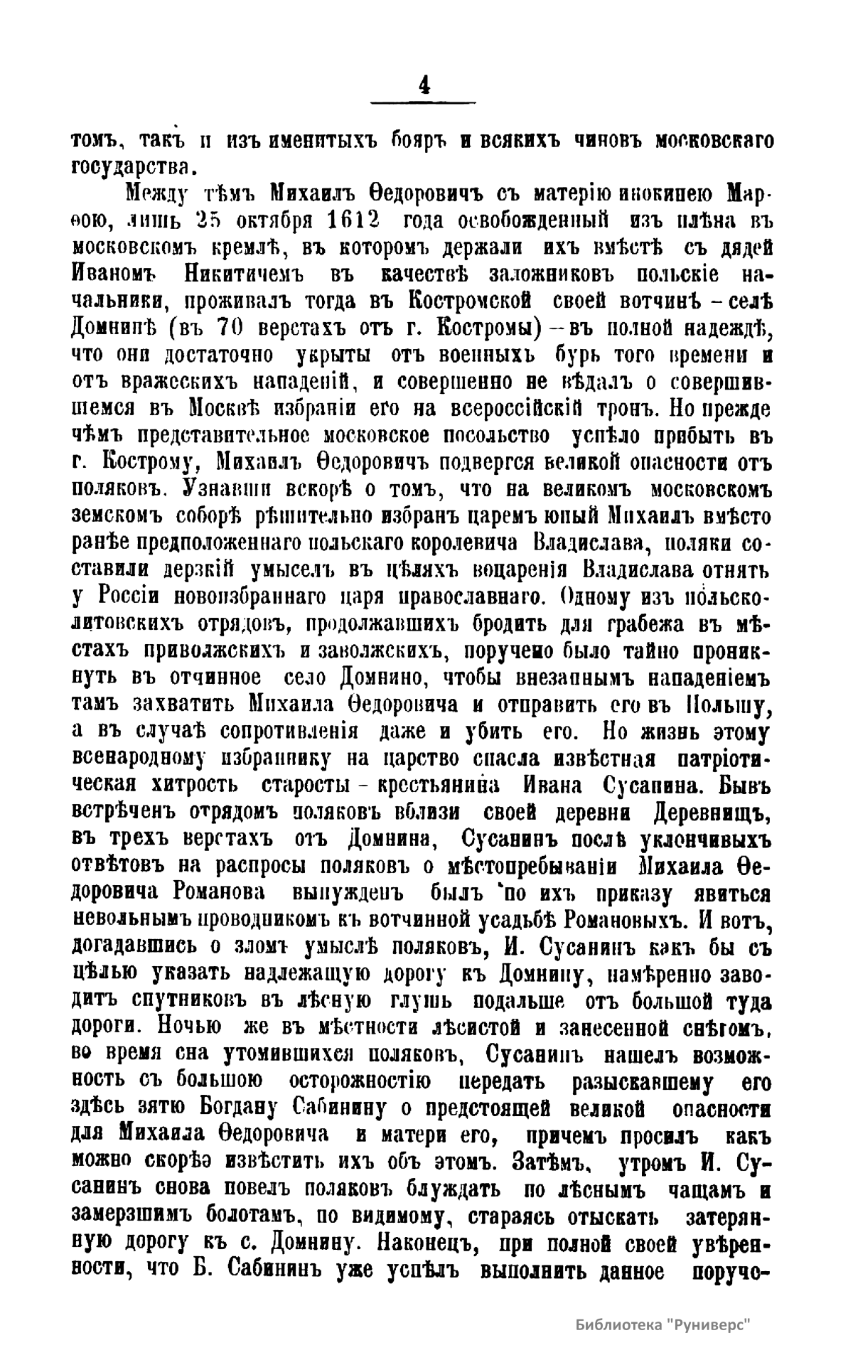 Романовы – боярский род в России XIV – XVI вв., потомки выходца из Литвы Андрея Кобылы. До начала XVI в. именовались Кошкиными, до конца XVI в. – Захарьиными. С 1613 г. царская, с 1721 г. – императорская династия. Михаил Федорович – первый царь из рода Романовых. Настоящее издание подготовлено к трехсотлетней годовщине царствования Дома Романовых. Издатель считает необходимым к предстоящему юбилею установить с исторической точностью разные эпизоды, относящиеся к обстоятельствам избрания и воцарения Михаила Федоровича, и, в частности, проясняет вопрос, где Михаил Федорович Романов с матерью инокинею Марфою нашел безопасное для себя убежище от преследований поляков в начале 1613 года.