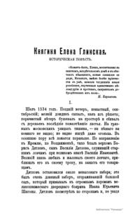 Глинские – княжеский род XV – XVIII вв. В 1508 г. после неудачного восстания в Литве в Россию выехал князь Михаил Львович с братьями. С 1526 г. он стал приближенным великого князя Василия III. Его племянница Елена Васильевна – вторая жена Василия III и великая княгиня (с 1526 г.). В 1533 – 1538 гг. – регентша Русского государства при малолетнем сыне великом князе Иване IV. В правление Елены большую роль в государственных делах играли ее фаворит князь И. Ф. Овчина-Телепнев-Оболенский и митрополит Даниил. Регентство Глинской отмечено успешной борьбой с сепаратизмом удельных князей и бояр (ликвидированы уделы Юрия Дмитровского, Андрея Старицкого в 1537 г., заговоры Андрея Шуйского и Михаила Львовича Глинского в 1533 – 1534 гг.). Правительство Глинской продолжило борьбу против роста монастырского землевладения. В 1535 г. была проведена денежная реформа, в результате которой в государстве была введена единая монетная система. Одновременно проводилось укрепление городов, особенно на западных рубежах. В области внешней политики в результате ряда побед правительство Глинской добилось перемирия с Литвой (1536) при нейтрализации Швеции. Предполагают, что Елена Глинская была отравлена. Настоящее сочинение написано в жанре исторической повести.