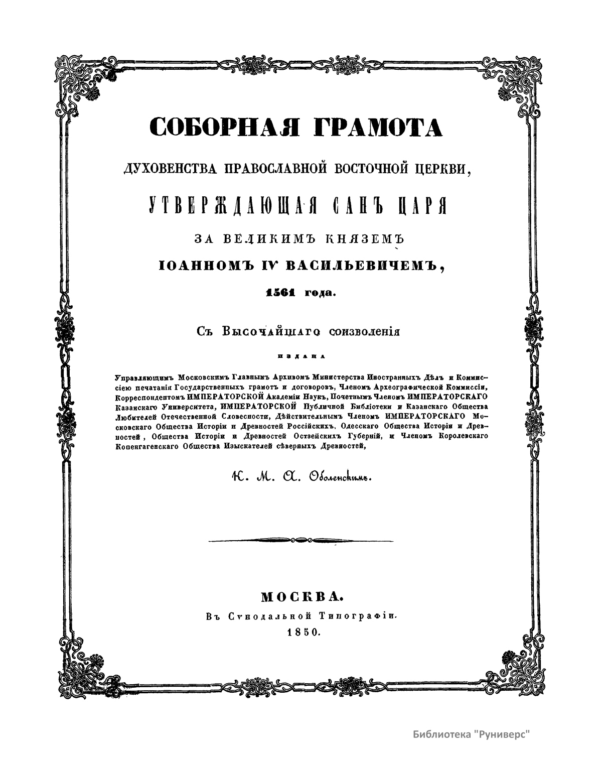 Соборная грамота духовенства православной восточной церкви, утверждающая санъ царя за Великимъ Княземъ Iоанномъ IV Васильевичемъ, 1561 года