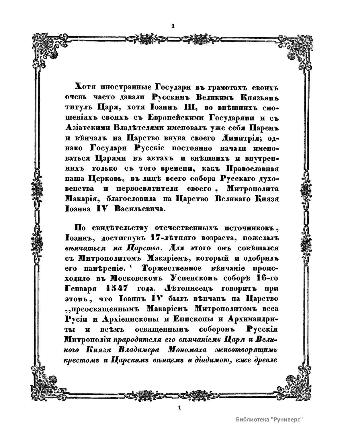 Иностранные государи в своих грамотах очень часто давали русским великим князьям титул царя. Иван III во внешних сношениях с европейскими государями и азиатскими владетелями уже именовал себя царем и венчал на царство своего внука Дмитрия. Однако русские государи постоянно начали именоваться царями в актах и внешних, и внутренних только с того времени, как православная церковь в лице всего собора русского духовенства и первосвятителя митрополита Макария благословила на царство великого князя Ивана IV Васильевича. Торжественное венчание происходило в московском Успенском соборе 16 января 1547 г. Помня всегдашнее духовное единение Руси с православной греко-восточной церковью и примеры прежних русских князей, которые, приняв христианскую веру от греческой церкви и утвердив ее в своем отечестве, издревле привыкли обращаться во всех важных церковных и государственных делах к патриарху цареградскому, Иван IV отправил посольство к тогдашнему патриарху Иоасафу, испрашивая благословение на свое царское достоинство и от православной восточной церкви. Патриарх созвал духовный собор. Иерархи православной восточной церкви единогласно решили благословить русского великого князя Ивана Васильевича на царство, утвердив его особенной грамотой царем «законно и церковно». Эта грамота за подписью всех святителей, присутствовавших на соборе, изготовлена в 1561 г. Побудительной причиной, по которой собор и патриарх благословляют Ивана Васильевича на царство, в грамоте приведены не только его доблести и заботы о церкви, но также его царское происхождение от греческой царевны Анны, сестры византийского императора Василия, и царское венчание одного из предков Ивана IV, великого князя Владимира, митрополитом Ефесским и патриархом Антиохийским, которые были специально для этого отправлены императором византийским Константином Мономахом. Подлинник, по которому напечатана соборная грамота духовенства восточной православной церкви, хранилась в Государственном архиве министерства иностранных дел.