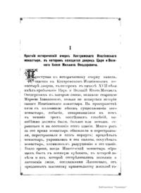 Исторический очерк по делам и документам Ипатьевского архива. В издании представлены: краткий исторический очерк костромского Ипатьевского монастыря (10); сообщение о месте, занимаемом палатами Романовых в монастыре, когда и кем они построены, кто занимал это здание до и после 1613 г. (19); сообщение о состоянии наместнических келий в XVII и XVIII вв. (28); о наместнических кельях в начале XIX в., которые принимают название царских чертогов и дворца царя и великого князя Михаила Федоровича, и о ряде мер со стороны епархиального начальства к охранению чертогов от разрушения (41); о следах особого внимания членов царствующего Дома к келиям Михаила Федоровича в Ипатьевском монастыре по делам и документам с XVII по XIX в. (67); о посещении Ипатьевского монастыря и палат Михаила Федоровича Высочайшими особами царствующего в России Дома. К изданию прилагаются: вид костромского Ипатьевского монастыря с восточной стороны (8); портрет Михаила Федоровича (26); портрет патриарха Филарета Никитича (80); портрет великой старицы инокини Марфы Иоанновны (82); изображение памятника костромскому крестьянину Ивану Сусанину, «за царя, спасителя веры и царство живот свой положившему» (66); план Ипатьевского монастыря 1794 – 1799 гг. и его экспликация (93); смета майора и архитектора Мичурина на исправление ветхостей в кельях наместнических 1742 г.; вид палат царя Михаила Федоровича в 1832 г. (100); различные планы палат; опись древностей Ипатьевского монастыря (104).