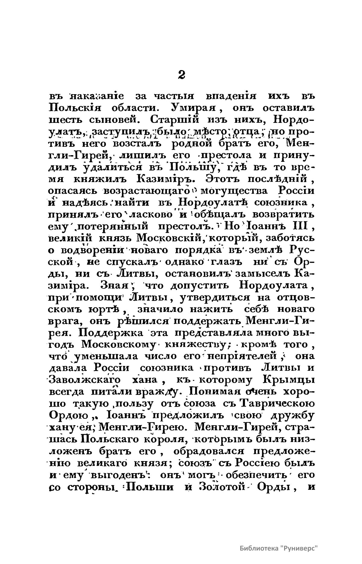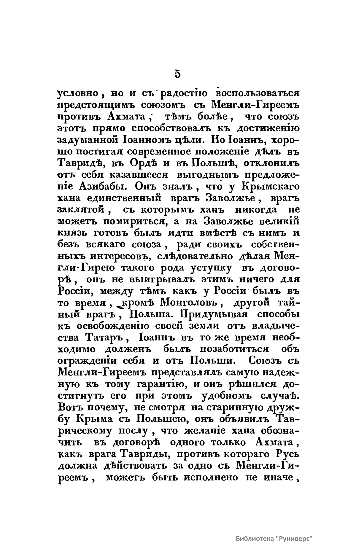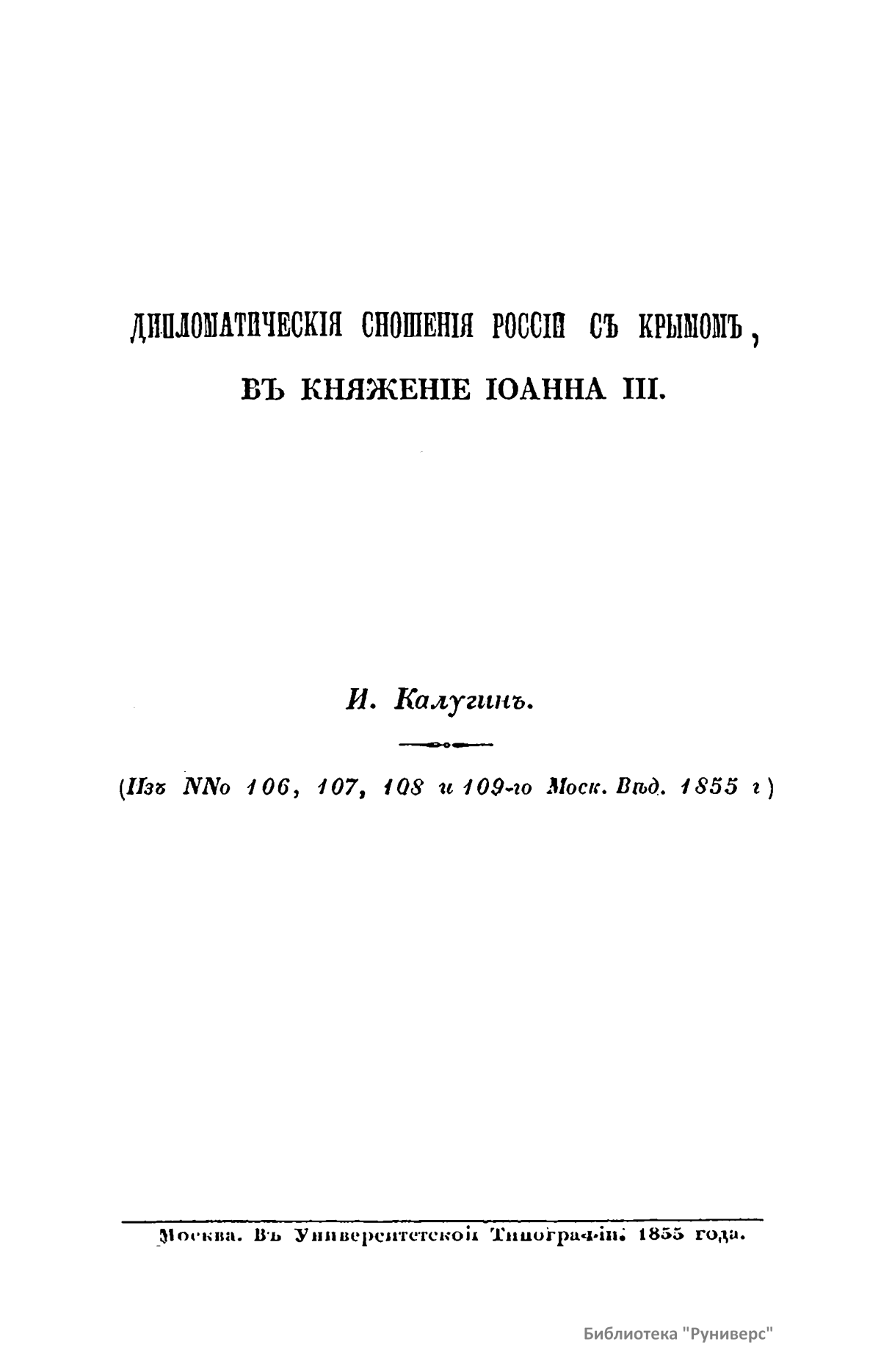 В брошюре опубликованы материалы из четырех номеров «Московских ведомостей» за 1855 г., посвященные крымской политике Ивана III. Иван III поддерживал крымского хана Менгли-Гирея, обеспечивая себе союзника против Литвы и Заволжского хана. Менгли-Гирей, в свою очередь, укреплял свое положение на Крымском юрте. По договору 1473 г. между Россией и Крымом, крымский хан обязывался «быть с великим князем в братской дружбе, любви и вечном мире, стоять с ним заодно на всех его недругов, не воевать владений Московского княжества, казнить разбойников и возвращать все отнятое ими у русских подданных, выдавать пленных без выкупа, давать послам свободный проезд и не брать с них пошлин». Великий князь обязывался только двумя статьями: помогать хану против его неприятелей и дозволять крымским послам свободно и без пошлин приходить в Россию. Отношения с Крымом росли и развивались с каждым годом до смерти Ивана III в 1505 г., прервавшей его намерение возвратить при помощи Крыма все отторгнутые некогда Литвой русские области за Днепром.