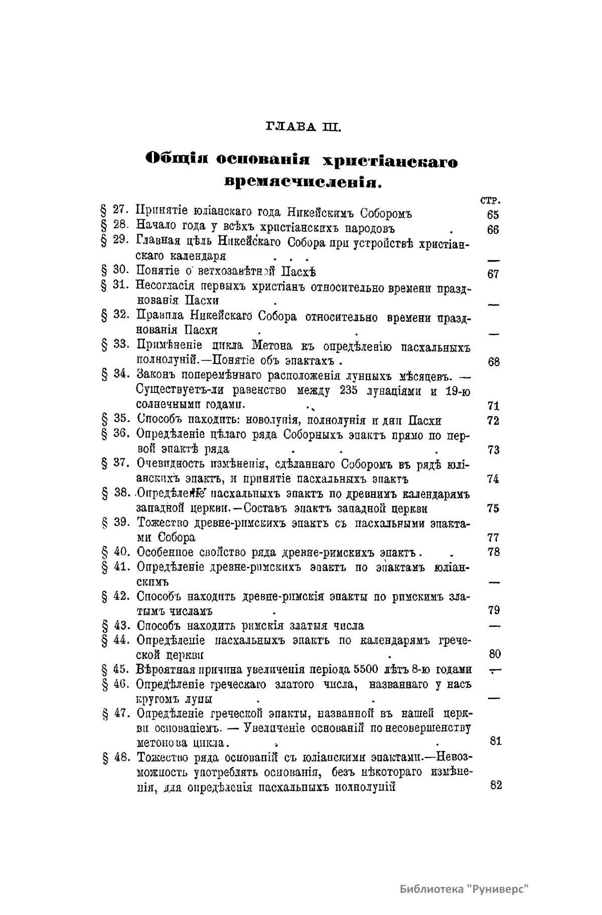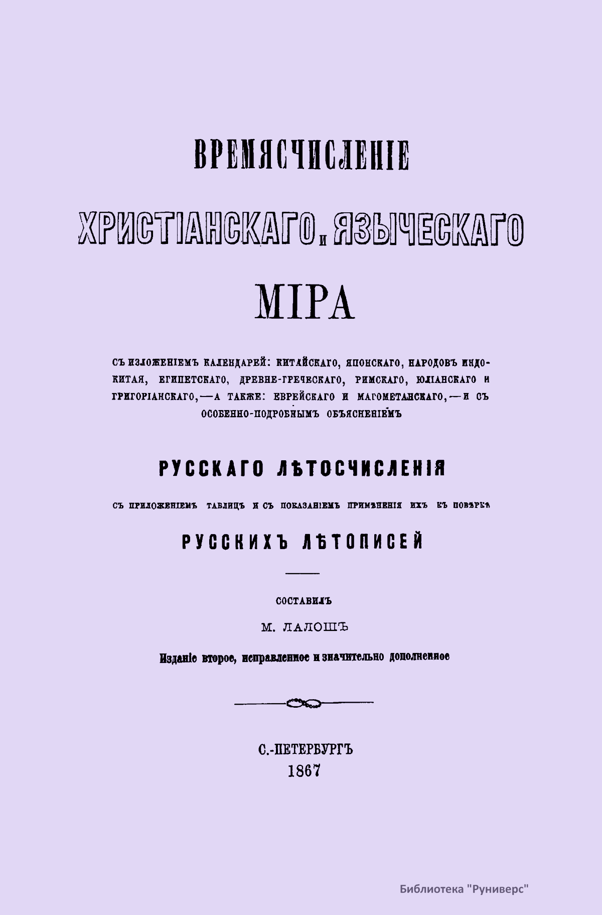 Издание предназначено для тех, кто испытывает потребность в знании правил, на которых основано времясчисление у разных народов. Автор излагает календари народов нехристианских: китайцев, японцев, народов Индокитая, египтян, древних греков, римлян, евреев, магометан; говорит об общих основаниях христианского времясчисления, о времясчислении, принятом Русской православной церковью. Отдельные главы посвящены применению пасхалии к поверке летописей и определению дня Пасхи по правилам Григорианского счисления.
