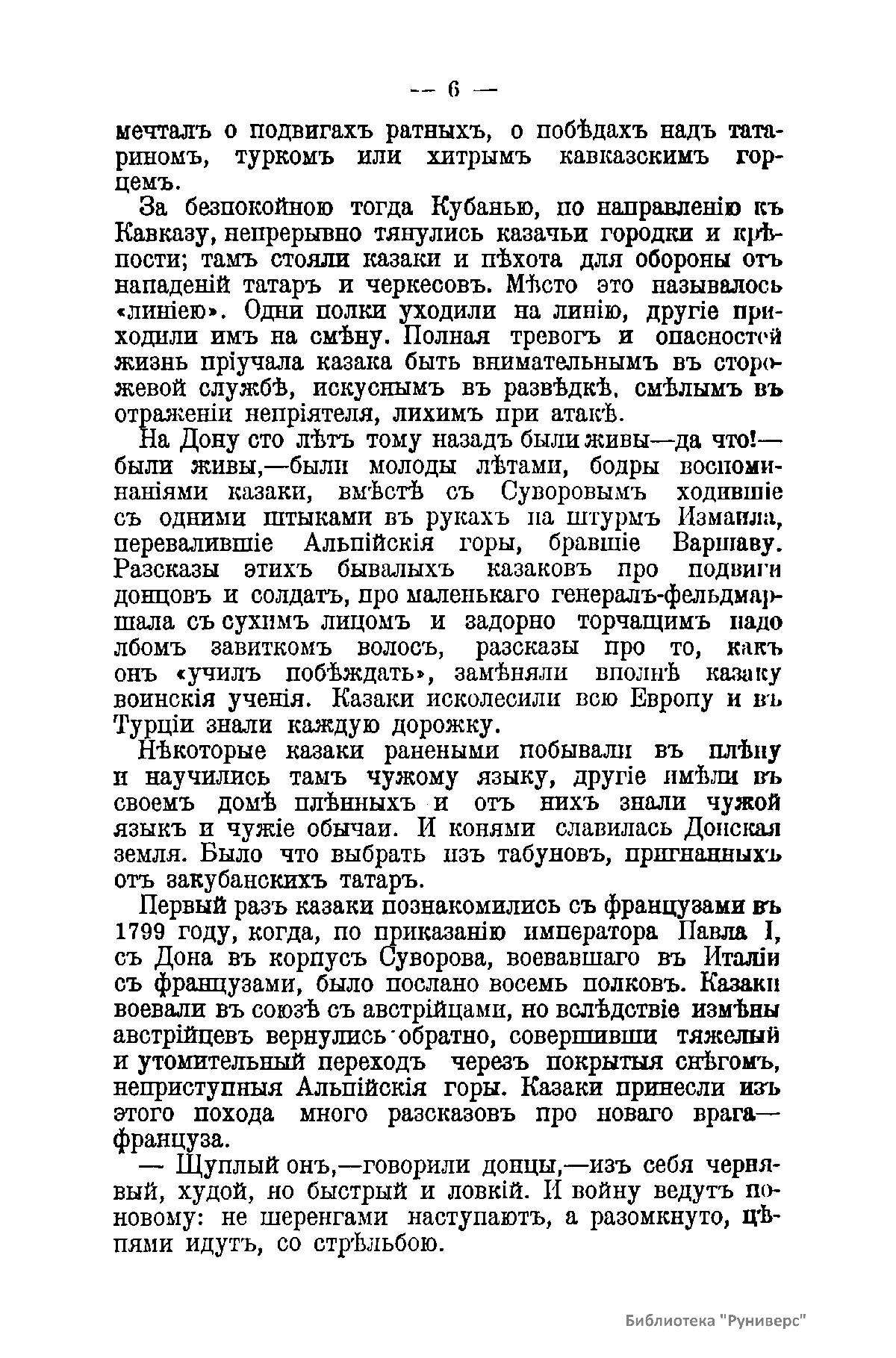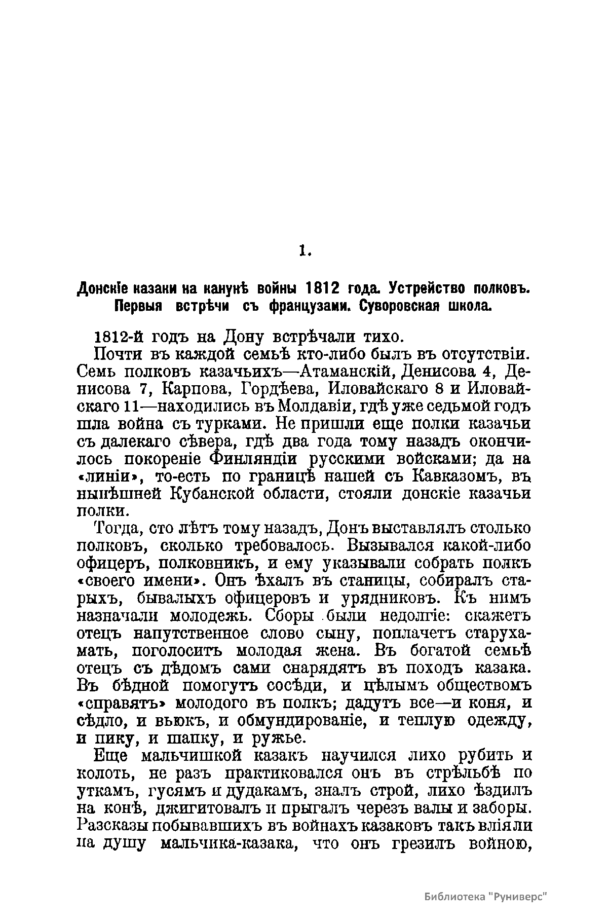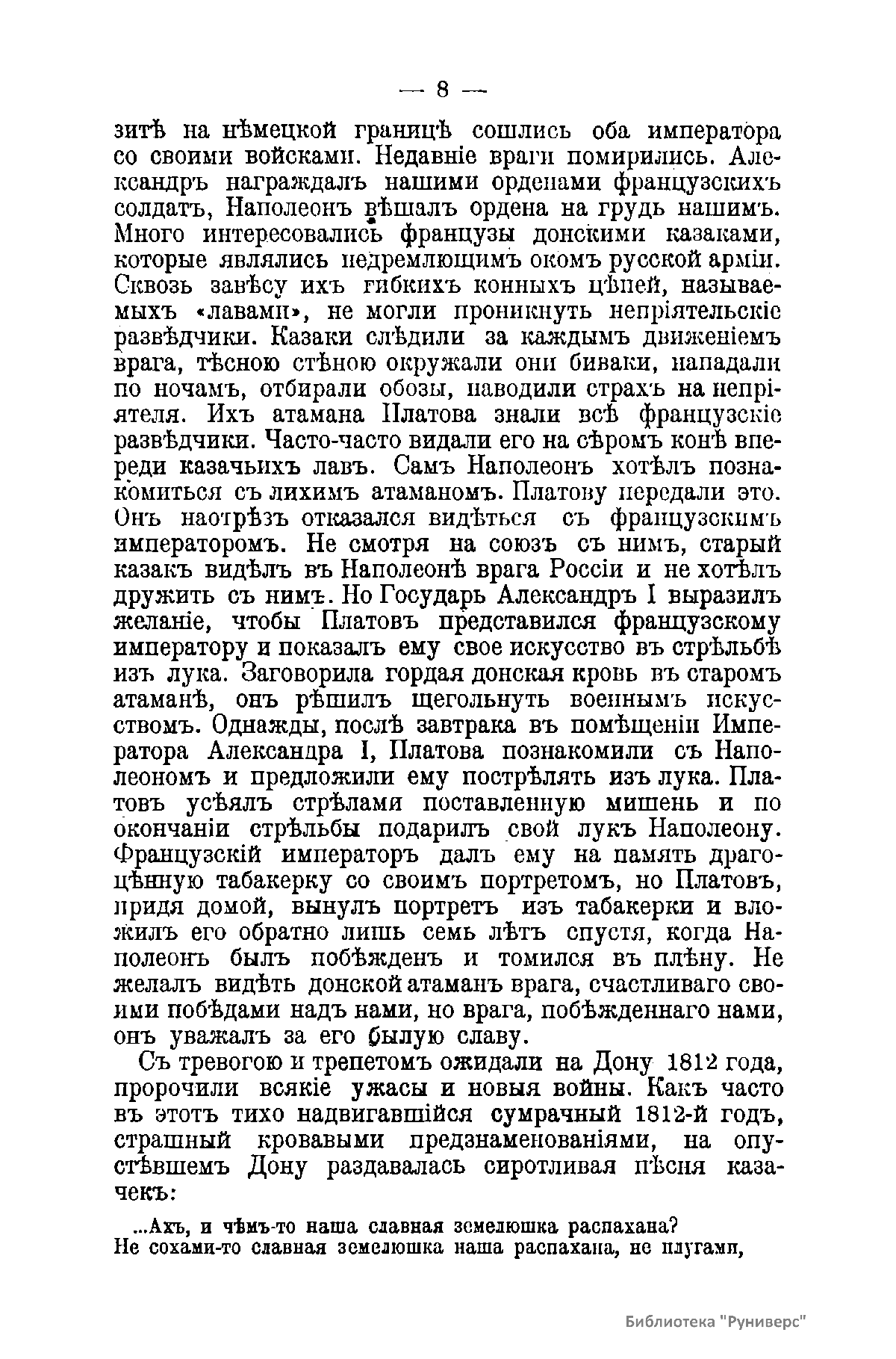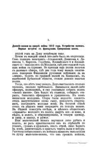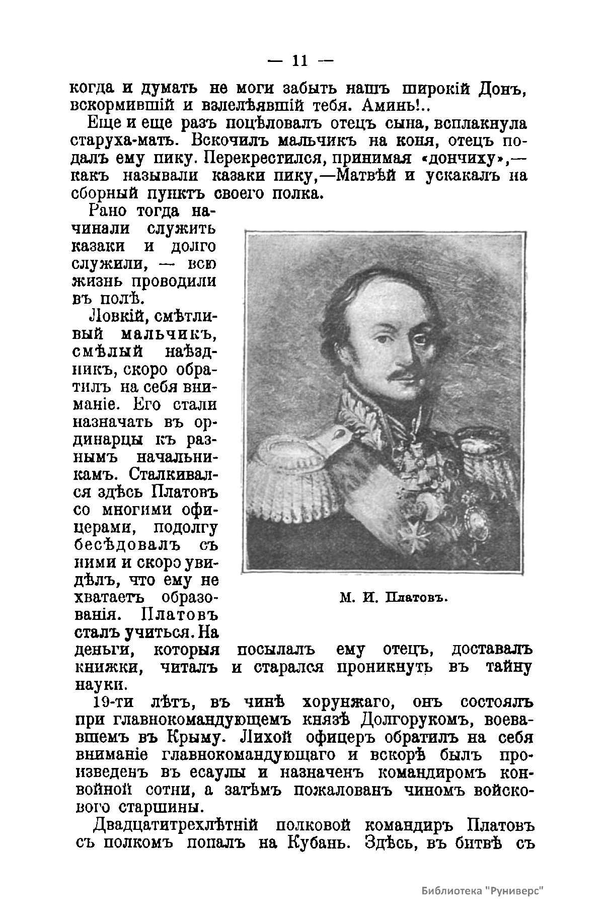 В книге изложена биография Платова М.И., подробно описано его участие в войне 1812 г. Платов Матвей Иванович (1751 – 1818) – граф (с 1812 г.), войсковой атаман Донского казачьего войска, генерал от кавалерии. Сподвижник А.В. Суворова. В Отечественную войну 1812 г. и в 1813 – 1814 гг. успешно командовал донским казачьим корпусом. В Бородинском сражении совершил рейд в тыл противника.