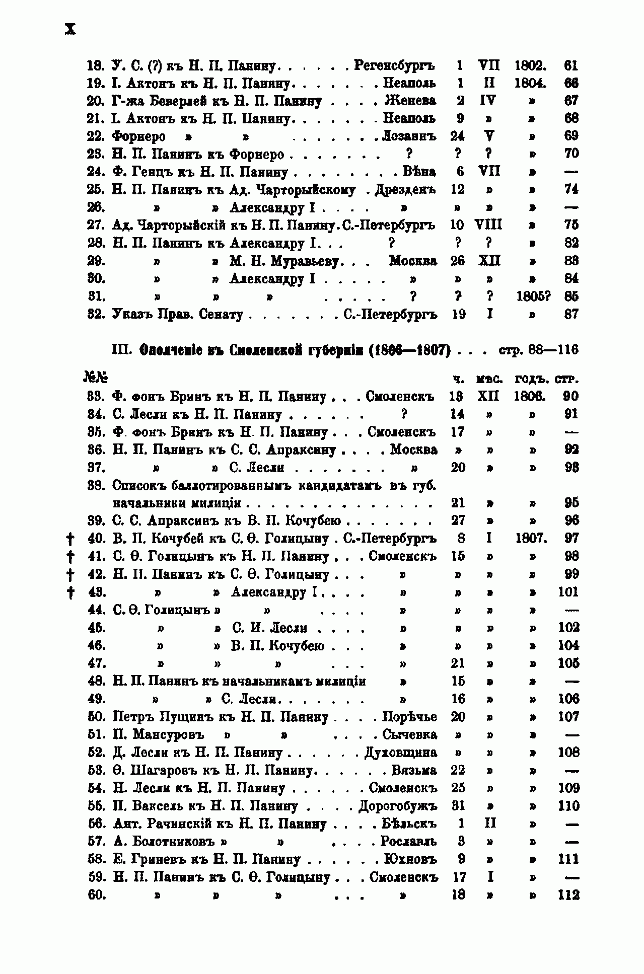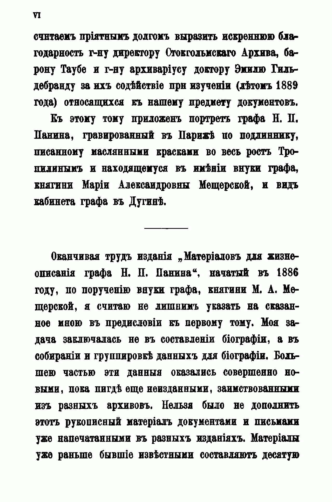 По поручению внучки Н. П. Панина, княгини М. А. Мещерской, А. Г. Брикнер с 1886 г. начал собирать и публиковать материалы для биографии графа. Последний, седьмой, том материалов посвящён частной жизни Панина с 1802 г. до его кончины в 1837 г. Здесь собраны сведения о путешествии графа в Финляндию в 1802 г.; о путешествии по Европе и окончательной опале (1802 – 1804); об участии в устройстве ополчения в Смоленской губернии (1806 – 1807); о деле с Ростопчиным (1813 – 1814); о жизни в Дугине (1816 – 1837), а также различные письма и записки. Большая часть документов написана по-французски.