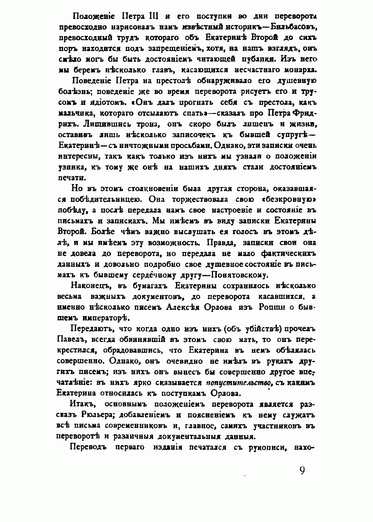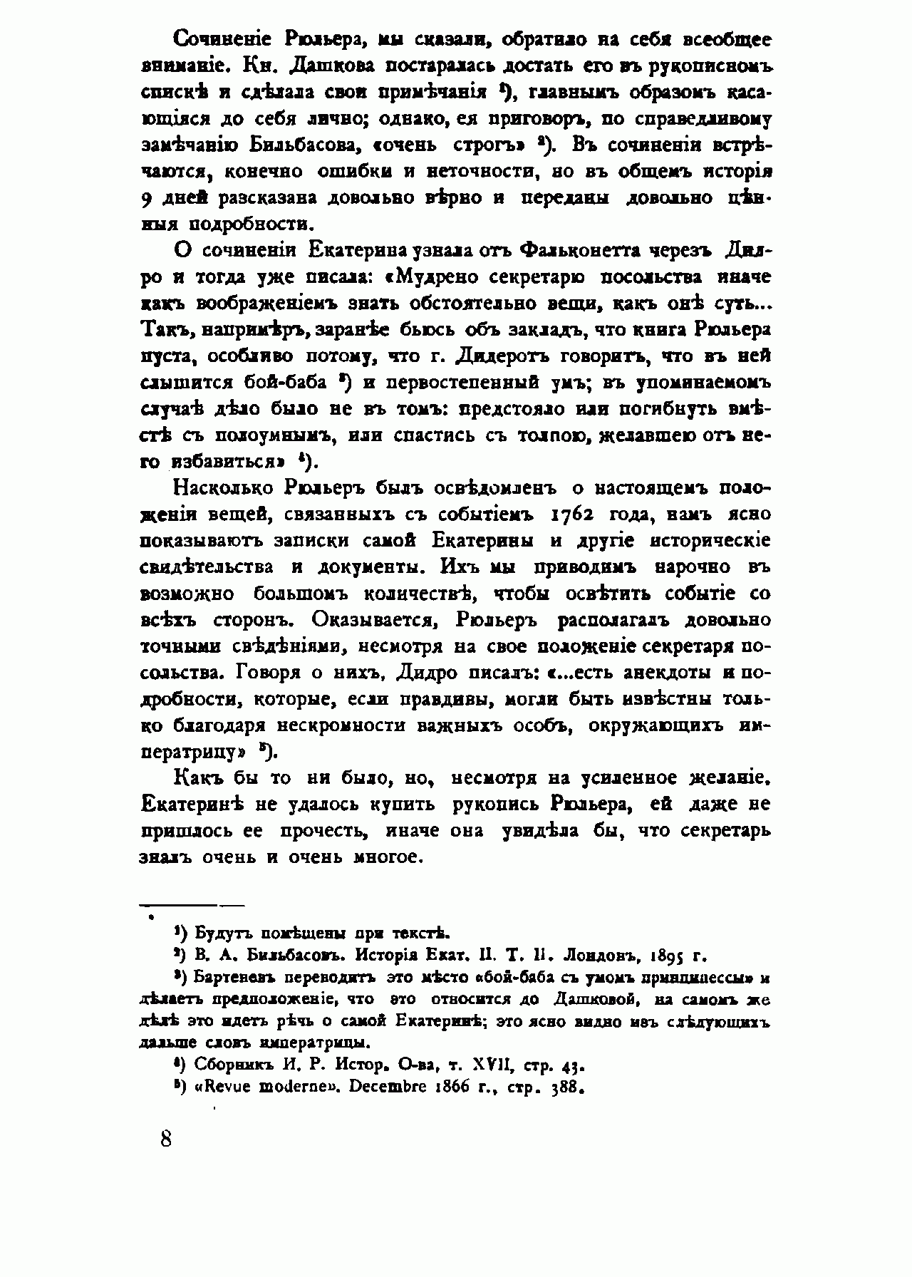 Публикация сочинения секретаря французского посла в России Рюльера о ходе подготовки и осуществлении дворцового переворота 1762 г., приведшая на трон Екатерину II, дополненная многочисленными письмами и воспоминаниями современников. Это издание имело огромную популярность.