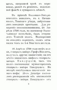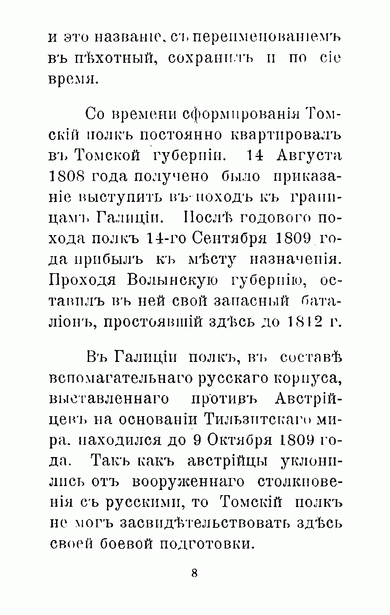 Полковая хроника составлена в связи с празднованием 100-летия 39-го Томского пехотного полка. Двухбатальонный Томский мушкетерский полк был сформирован 29 ноября 1796 года в Томске из Екатеринбургского и Семипалатинского полевых батальонов. Летом 1808 г. полк навсегда покинул Томскую губернию и был переведен в Омск, откуда вместе с остальными сибирскими полками начал длительный поход на запад – в Волынскую губернию, куда прибыл в сентябре 1809 г. С тех пор он постоянно дислоцировался на западных рубежах России. За долгие годы своей истории полк принимал активное участие в Отечественной войне 1812 года, русско-турецкой войне 1828–1829 г., в венгерском (1849 г.) и польском (1863 г.) походах, внёс большой вклад в оборону Севастополя в ходе Крымской войны. С 1864 г. несколько раз менял свою дислокацию в юго-западных областях России, однако участия в боевых действиях вплоть до Первой мировой войны не принимал.