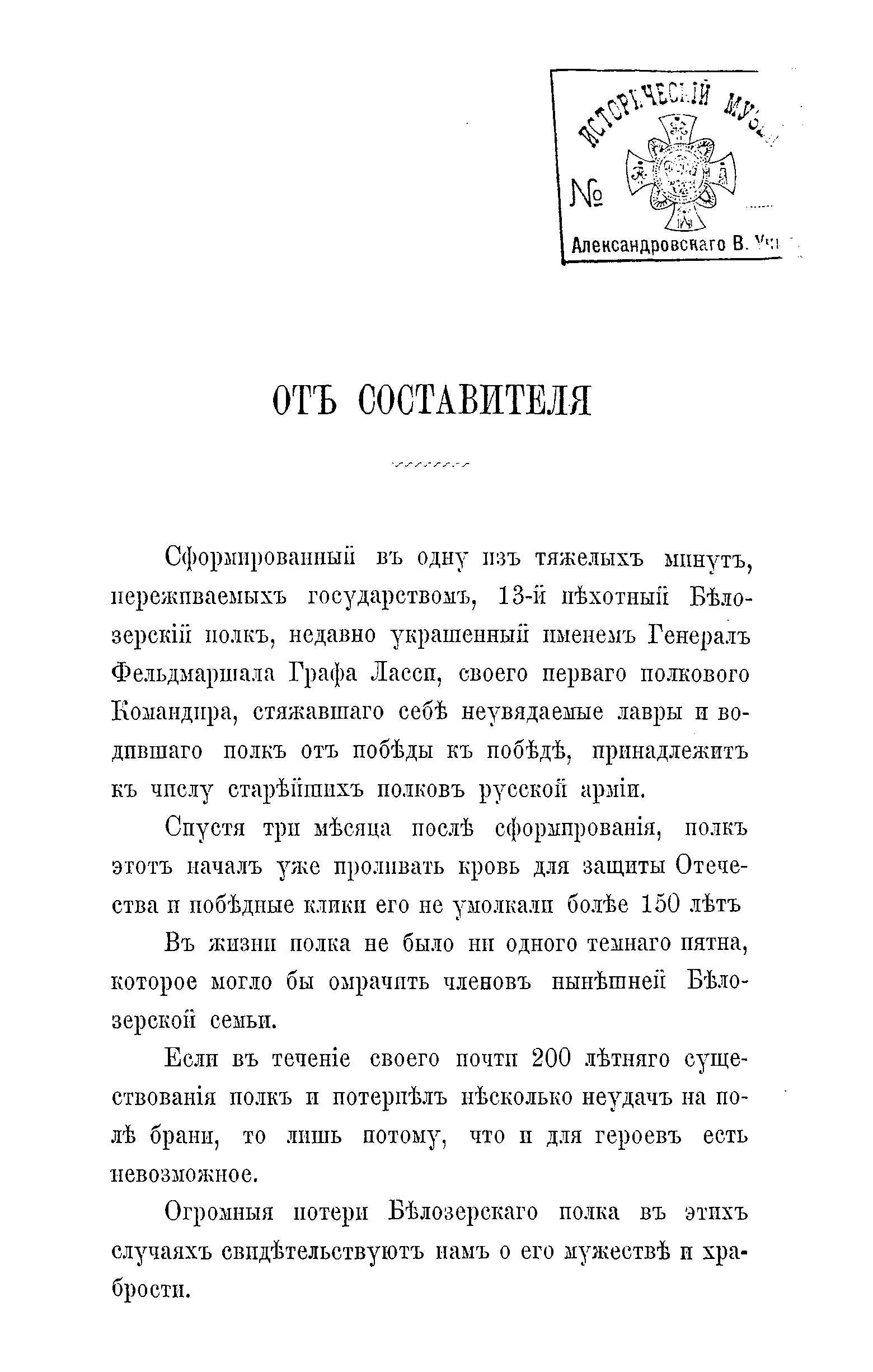 Исторiя 13-го пѣхотнаго Бѣлозерскаго Генерал-Фельдмаршала Графа Ласси полка (1708-1893г.)