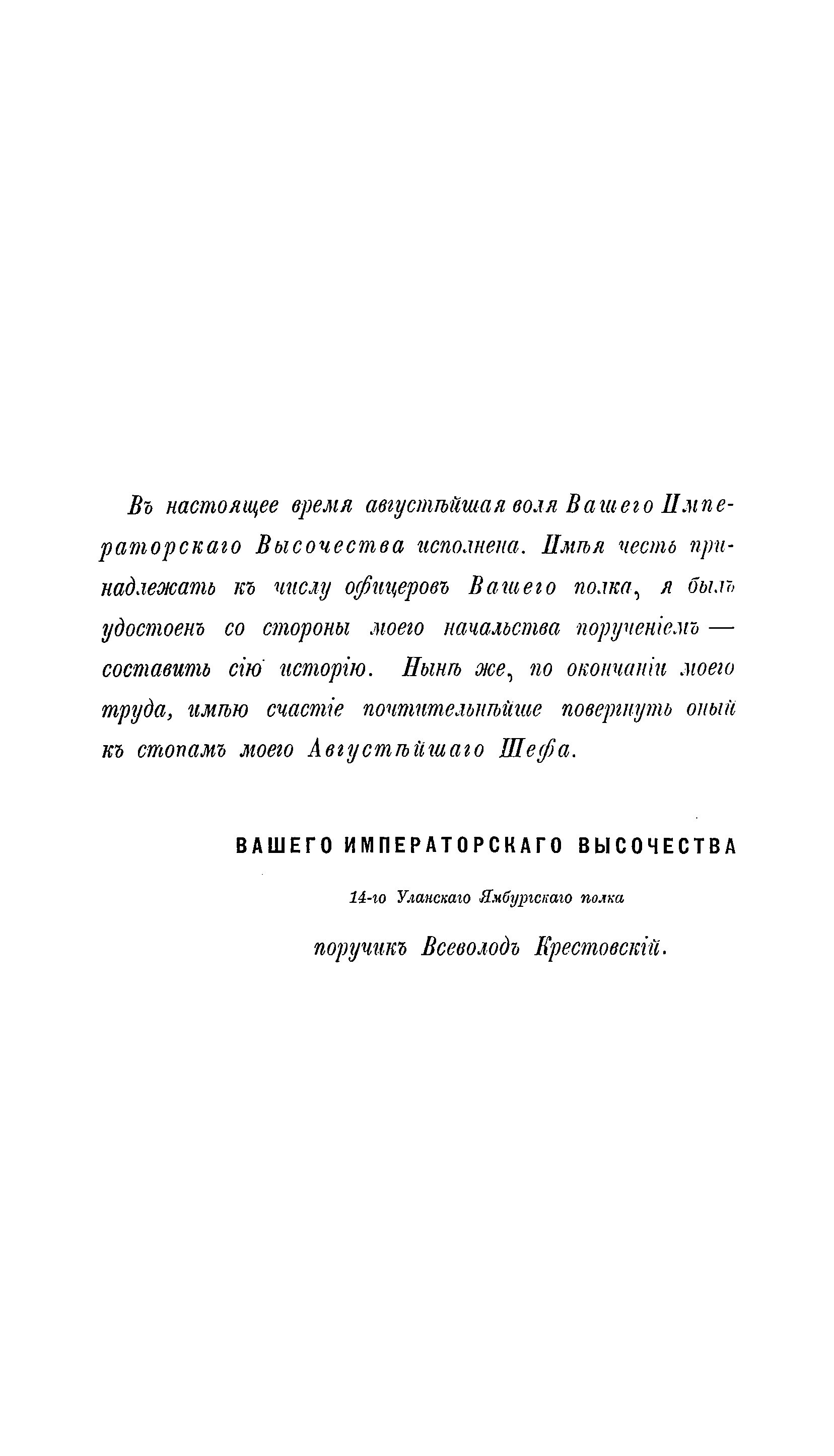 Документальное описание боевых действий полка и знаменательных исторических событий, связанных с ним, за период 1771 – 1871 годов. Приведены поименные послужные списки шефов, командиров и офицеров полка, кавалеров ордена св. Георгия. Крестовский Всеволод Владимирович — полковник, участник русско-турецкой войны 1877—1878 гг., писатель, с 1892 г. издатель и редактор издающейся в г. Варшаве русской литературно-политической газеты «Варшавский дневник». Произведения, написанные им после поступления на военную службу в конце 60-х годов: роман «Вне закона» (1873, 1876); историческая повесть «Деды» (1875, 1885, 1891); «История 14-го Уланского Ямбургского Ее Императорского Высочества Великой княжны Марии Александровны полка» (1873); «Из походных очерков» (1874); «На траве» (1876); «История Лейб-гвардии Уланского Его Величества полка» (1876); «Двадцать месяцев в действующей армии» (1879); описание в журнале «Русский вестник» кругосветного плавания в эскадре адмирала Лесовского в 1880 г.; «В гостях у эмира Бухарского» (1887); «Очерки кавалерийской жизни» (1892).