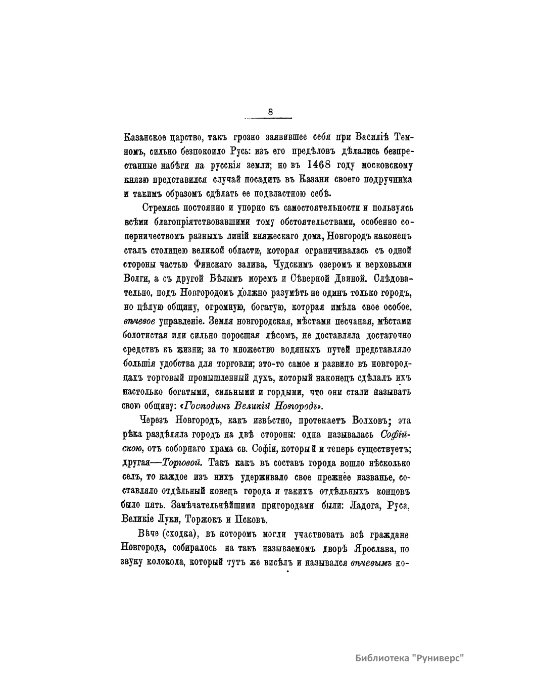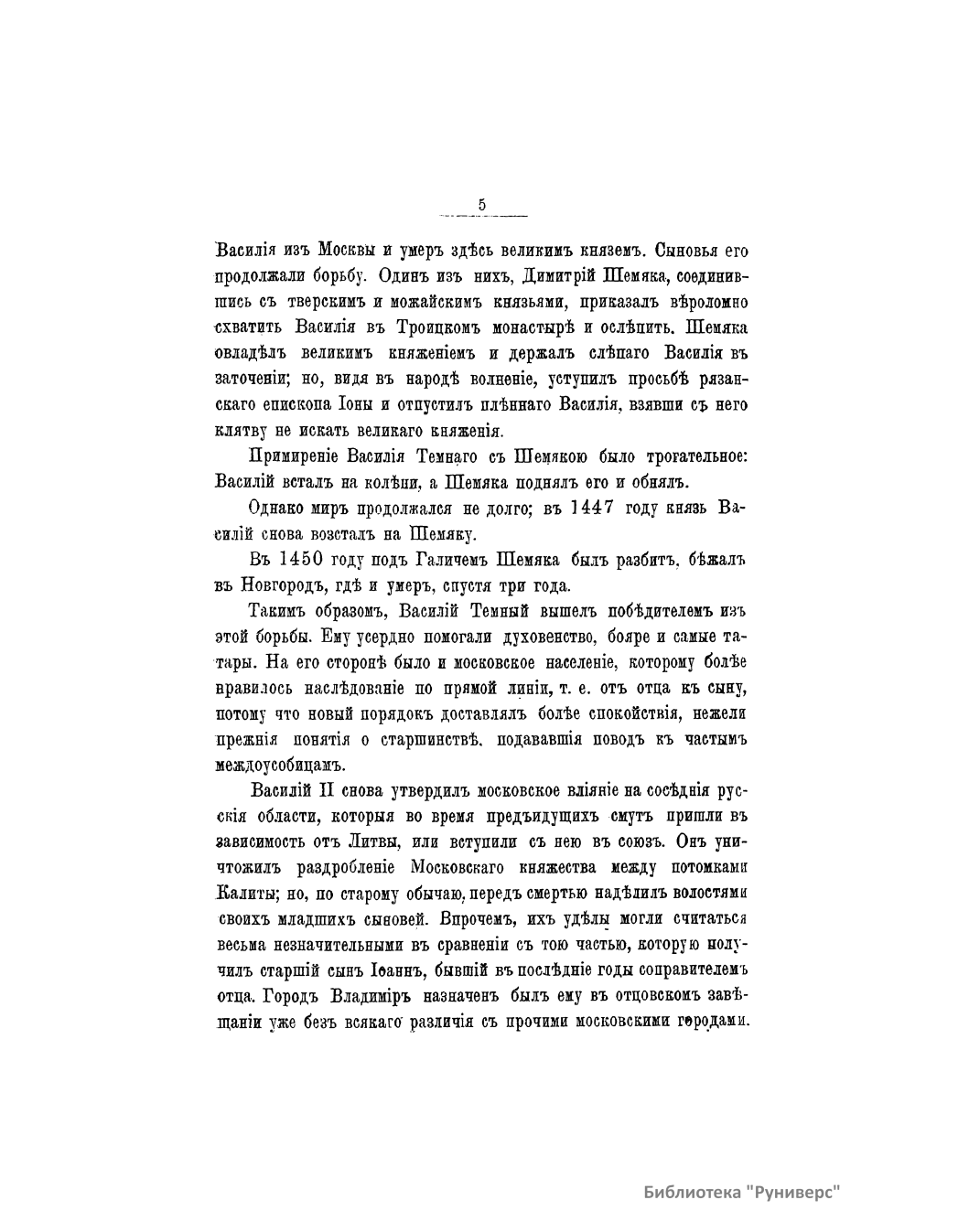 Популярная брошюра посвящена истории Московского княжества от смерти Дмитрия Донского до воцарения Ивана Грозного. Автор рассказывает о княжении Василия Дмитриевича, Василия II Васильевича (Темного), Ивана III Васильевича, Василия III Ивановича. Издание снабжено семью рисунками: Встреча иконы Владимирской Божьей матери на Кучковом поле. Примирение Василия Темного с Шемякою. Василий и сын его Иван III. Владыка Новгородский Симеон примиряет граждан. Уничтожение Новгородского веча. Иван III уничтожает ханскую басму. Торжество Василия III и кручина псковитян.