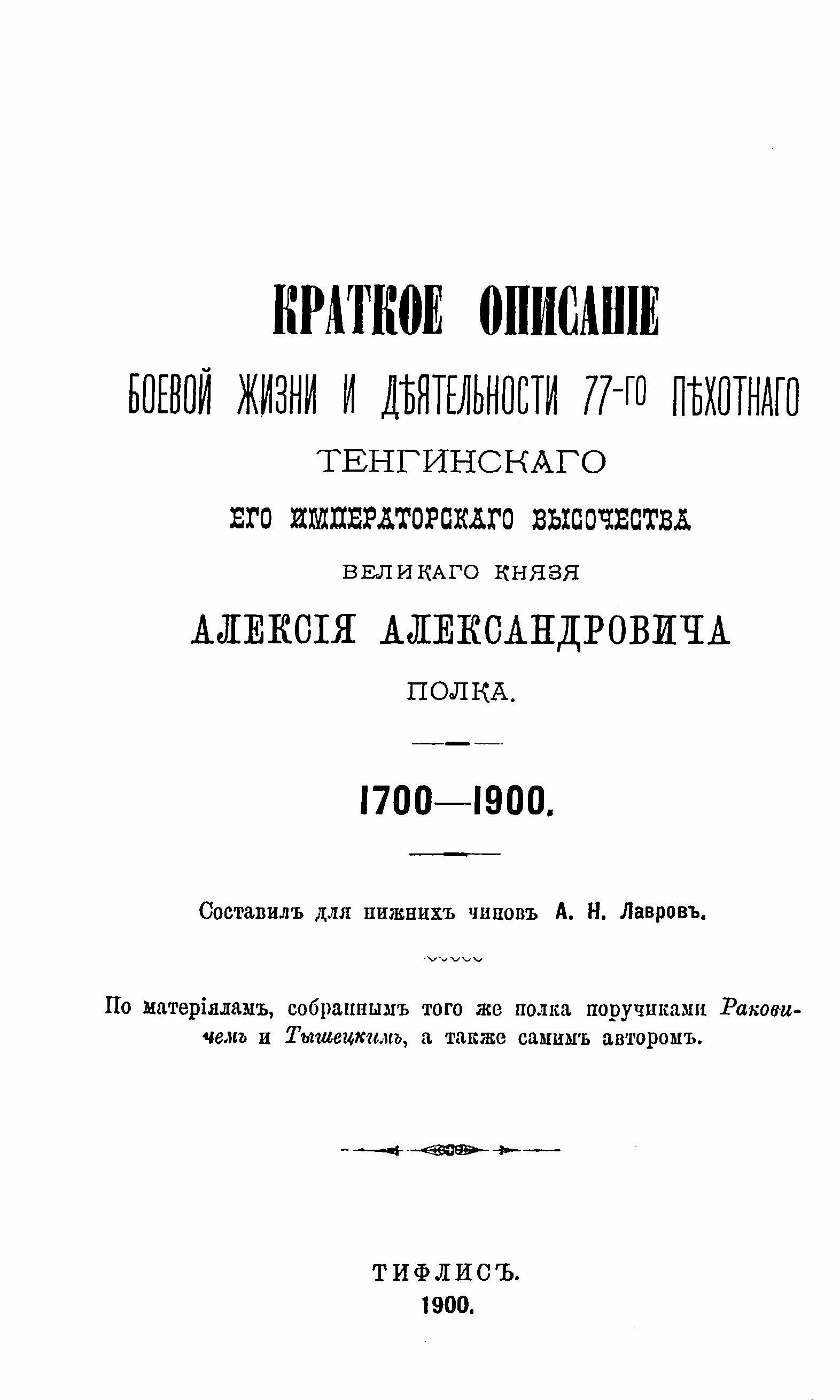 Краткое описанiе боевой жизни и дѣятельности 77-го пехотнаго Тенгинскаго Его Императорскаго Высочества Великаго Князя Алексiя Александровича полка. 1700-1900