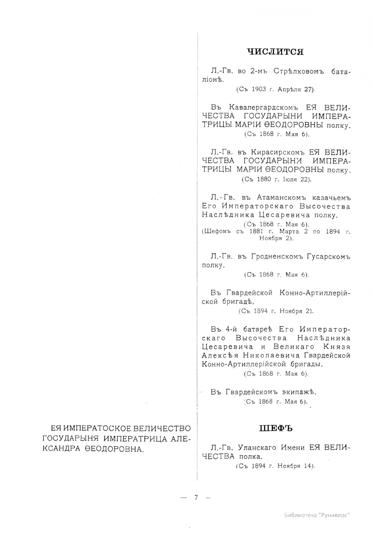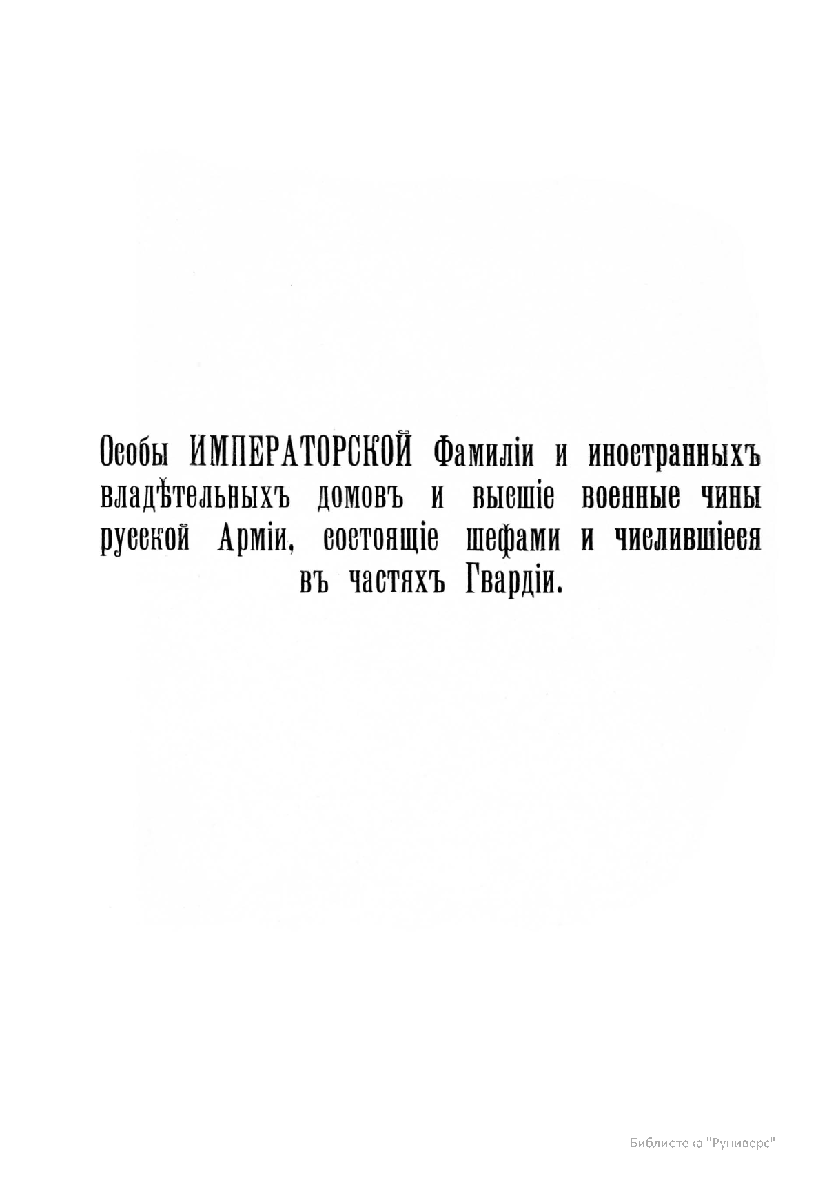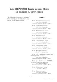Краткие истории частей Императорской гвардии, наименования и переименования, командиры, шефы, боевой путь, награды гвардейских частей. Широко известные цветные таблицы униформы, составленные В. К. Шенком.