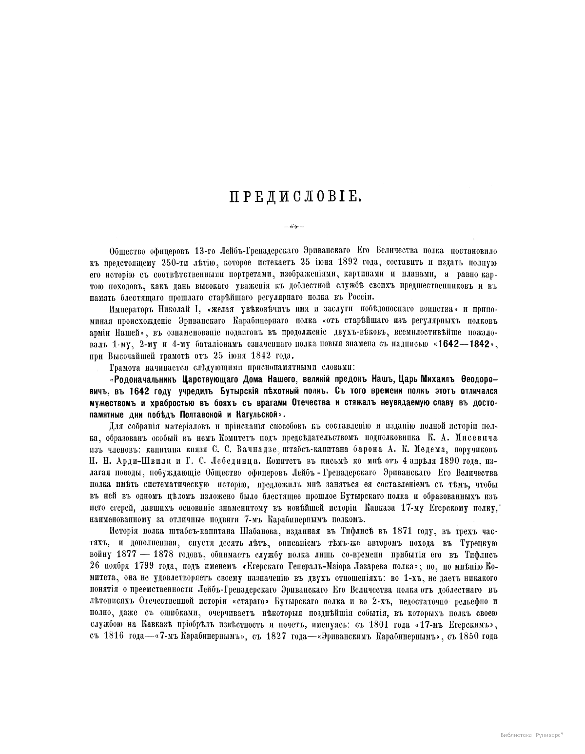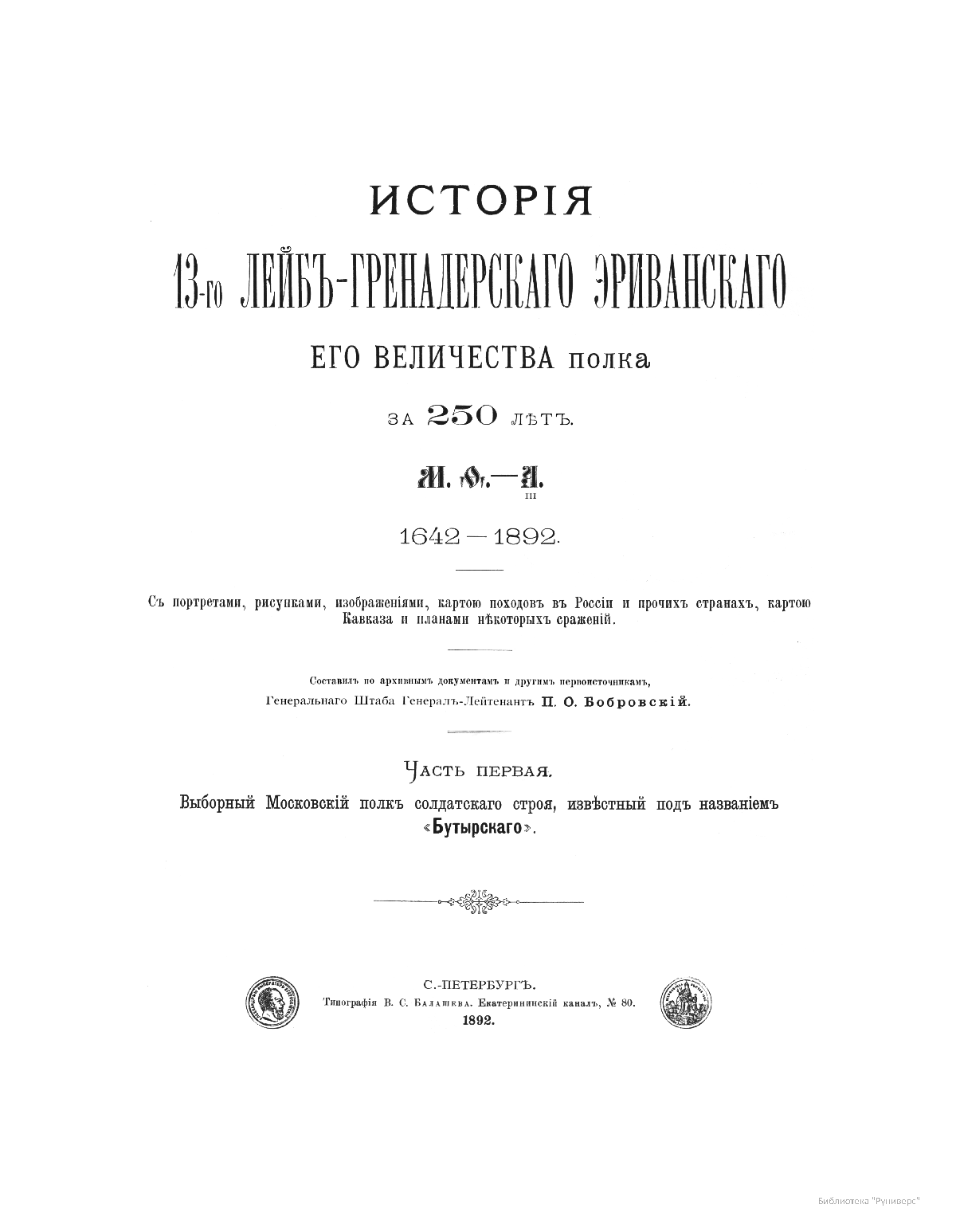 В 1892 году в Санкт-Петербурге вышло в свет пятитомное издание Генерального Штаба генерал-лейтенанта Павла Осиповича Бобровского, посвященное 250-летию 13-го лейб-гренадерского Эриванского eго величества полка – старейшего из регулярных полков российской армии.