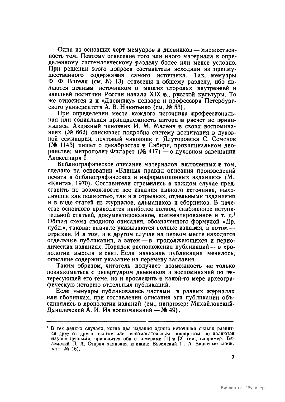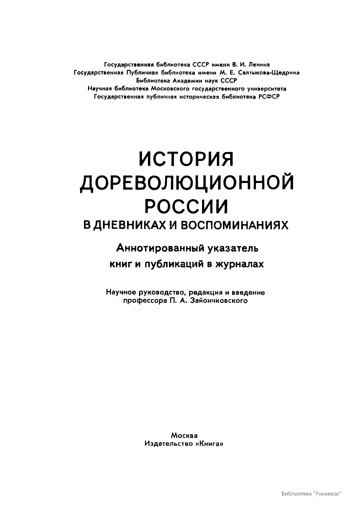 Многотомное издание этого уникального библиографического исследования, ставшего итогом многолетней работы большого коллектива ведущих отечественных источниковедов и библиографов главных библиотек нашей страны, представляет собой крупнейшее собрание аннотированной мемуарной литературы по истории России. Ведущую роль в создании этого фундаментального издания сыграл крупный отечественный ученый-историк П.А. Зайончковский, под редакцией и неусыпным контролем которого разрабатывался и выходил представленный многотомник (последние 5 книг вышли после кончины этого замечательного учёного-энциклопедиста).