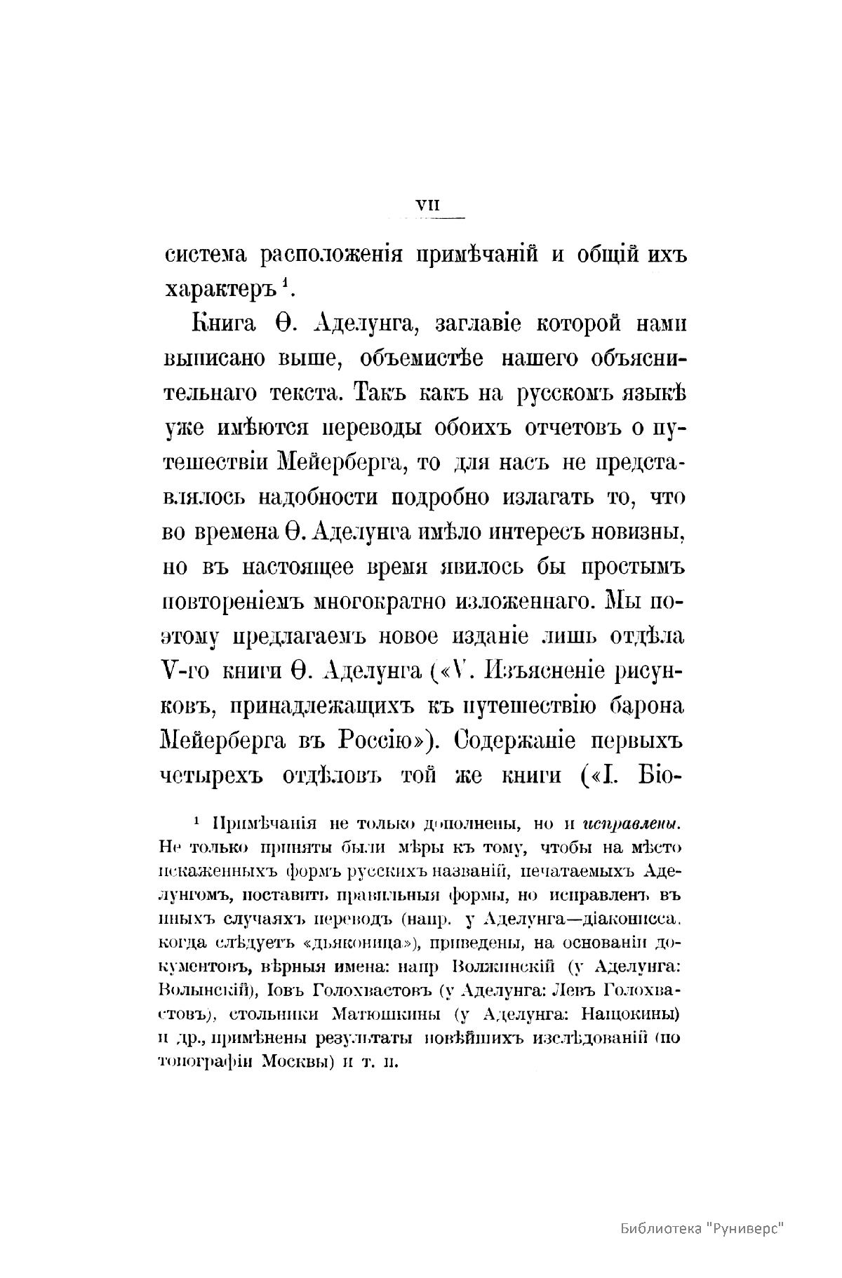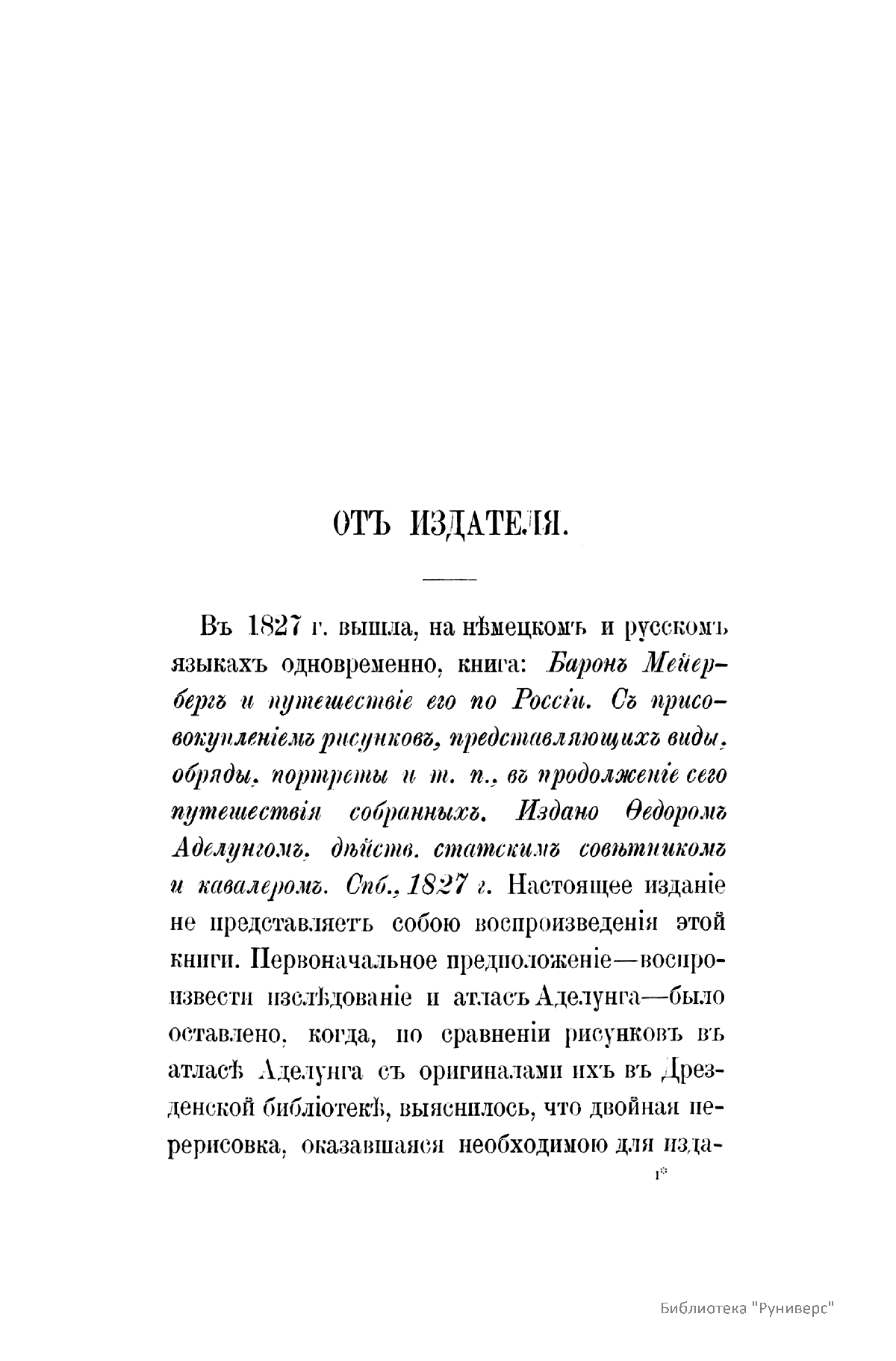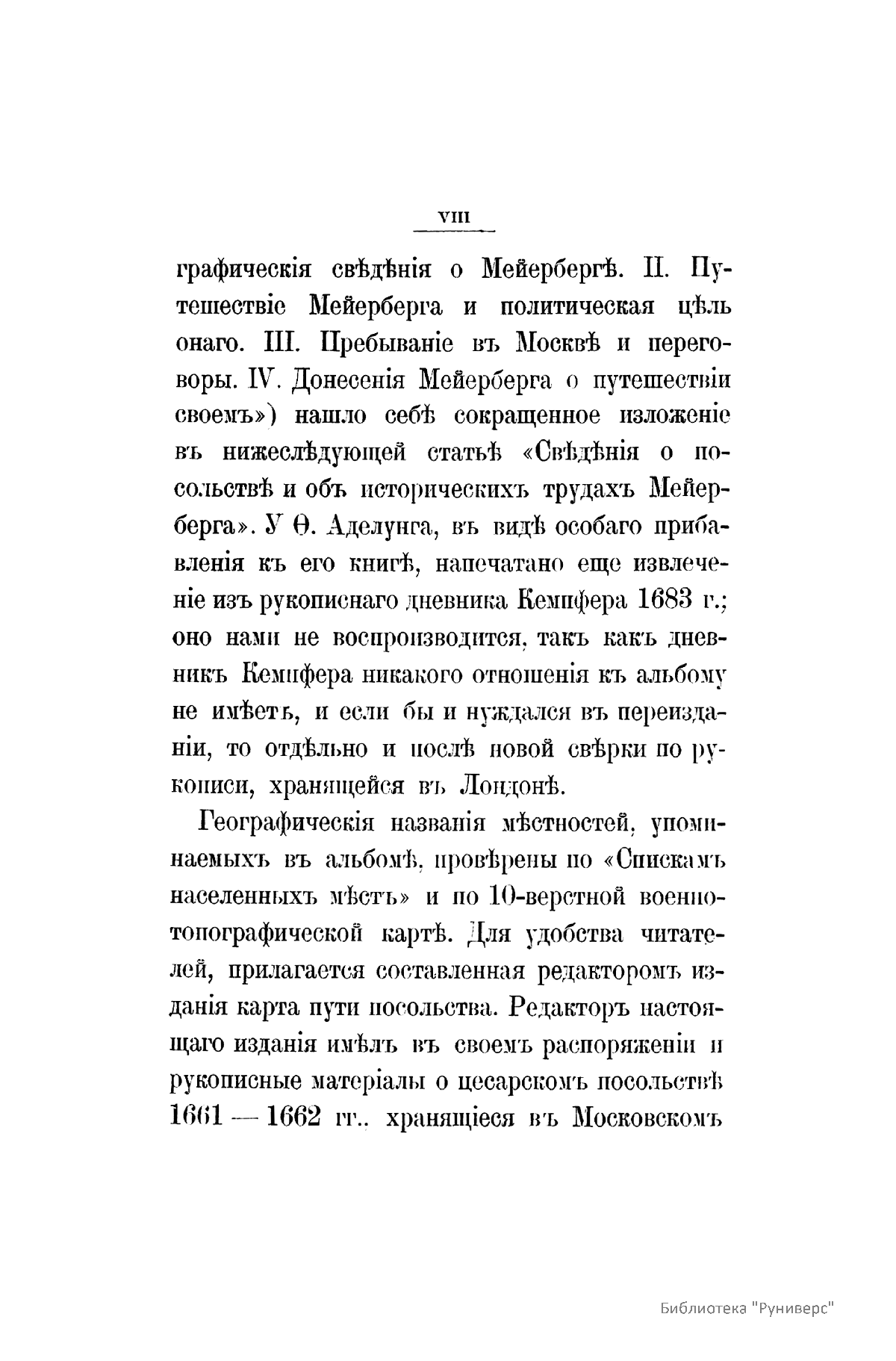 В библиотеке «Руниверс» находится только та часть альбома, куда входят «Сведения о посольстве и об исторических трудах Мейерберга» и «Объяснительные примечания к рисункам». Географические названия местностей, упоминаемых в альбоме, проверены по «Спискам населённых мест» и по 10-вёрстной военно-топографической карте. Редактор настоящего издания имел в своём распоряжении и рукописные материалы о посольстве 1661–1662 гг., хранящиеся в Московском главном архиве Министерства иностранных дел. Из этих материалов извлечены описания тех моментов в истории посольства, которые нашли себе изображение в альбоме. Таким образом, для сравнения читателю необходимо пользоваться двумя изданиями – 1827-го и 1903 года.