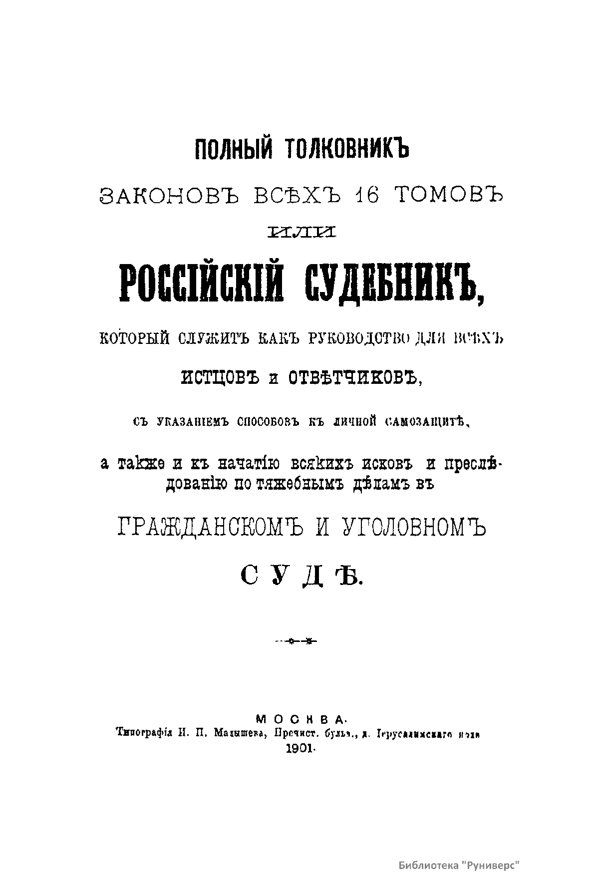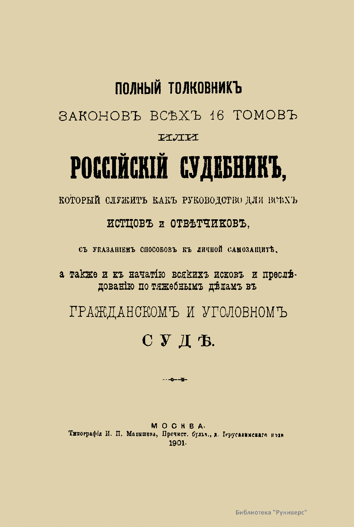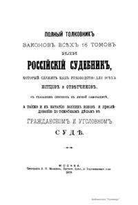 Полный толковникъ законовъ всѣх 16 томовъ или Россiйскiй судебникъ, который служитъ какъ руководство для всѣхъ истцовъ и отвѣтчиковъ, съ указанiемъ способовъ къ личной самозащитѣ, а также и къ начатiю всякихъ исковъ и преслѣдованiю по тяжебнымъ дѣламъ въ гражданскомъ и уголовномъ судѣ