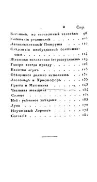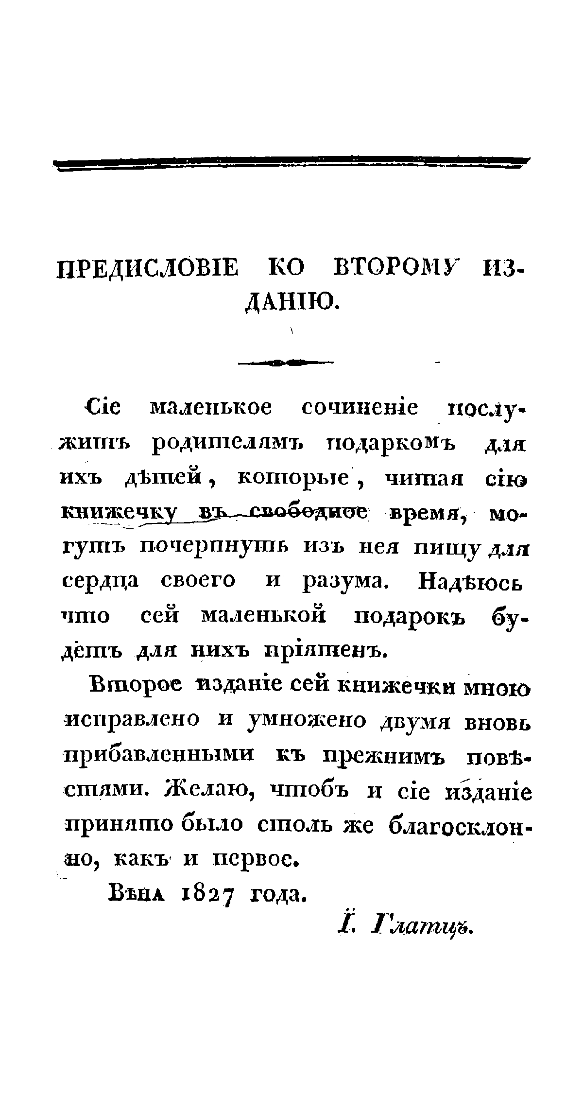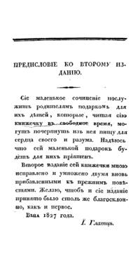 Второе издание весьма популярной в свое время детской книги предваряется предисловием автора: «Второе издание сей книжечки мною исправлено и умножено двумя вновь прибавленными к прежним повестями. Желаю, чтобы и сие издание принято было столь же благосклонно, как и первое». Русский переводчик, не пожелавший указывать своего имени, также приписывает к этому несколько слов, где «желает только, чтобы перевод его не был исключен из числа книг, назначенных почтенными родителями для чтения их детям и воспитанникам», а также поясняет, что немецкие стихотворения, приложенные к рассказам в этой книге, он по своей воле заменил на «оригинальные, писанные известными стихотворцами нашими». Очевидно, переводчик посчитал, что детям полезнее будет ознакомиться с образцами русской романтической поэзии, нежели немецкой.
