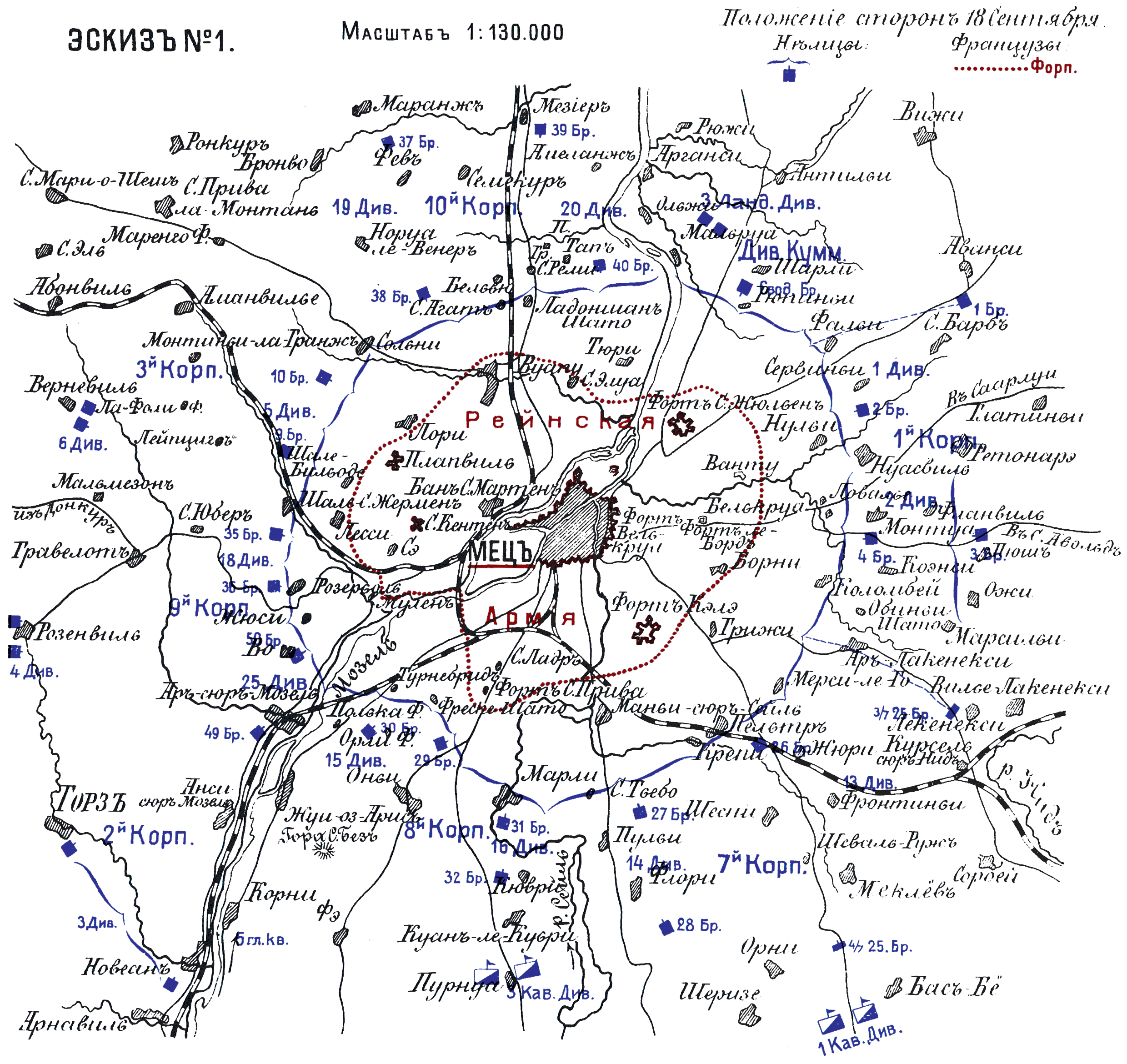 События и бои под Мецем от начала обложения до капитуляции. От 19 Августа до 27 Октября 1870. Эскиз №1. Положение сторон 18 сентября
