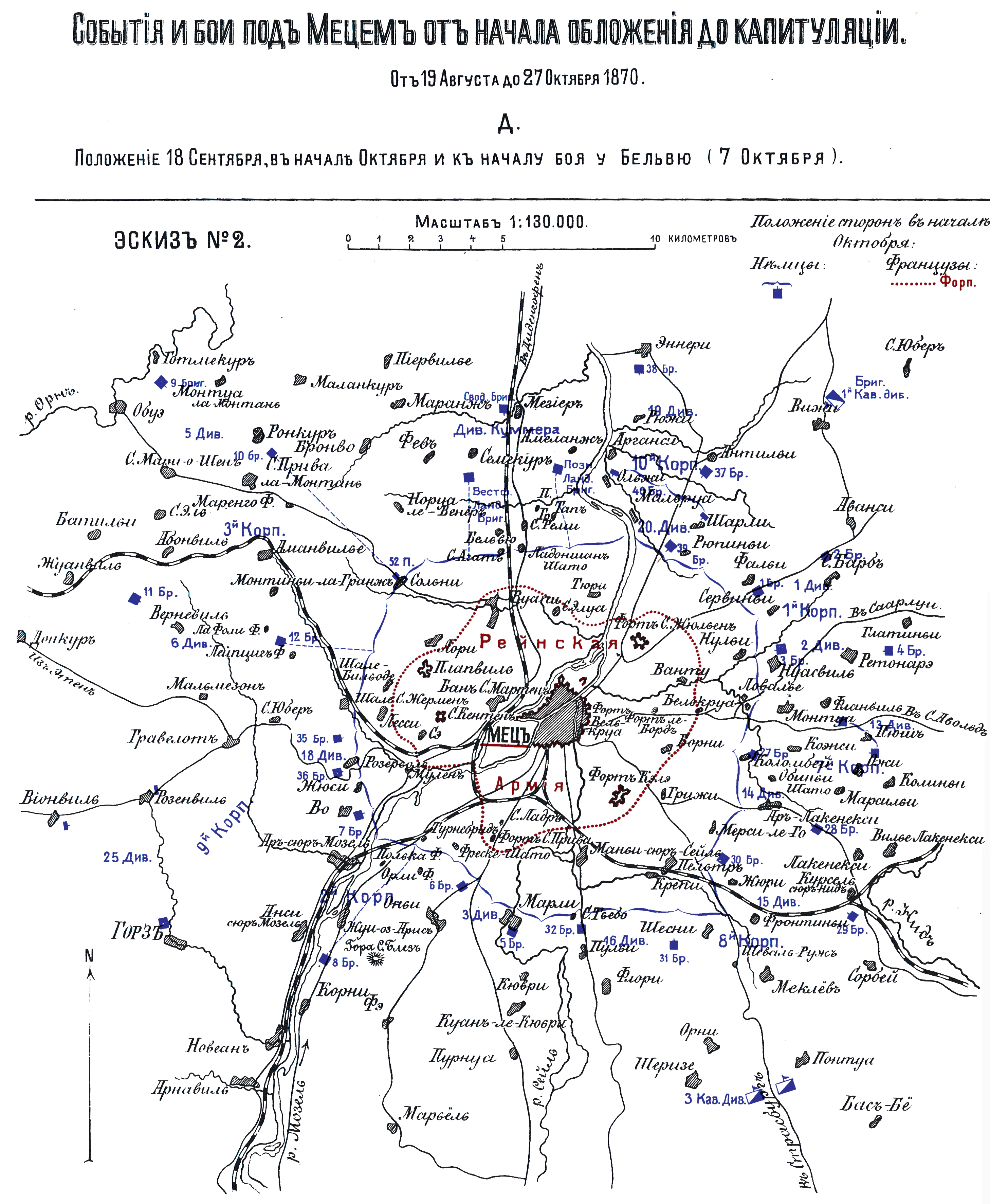 События и бои под Мецем от начала обложения до капитуляции. От 19 Августа до 27 Октября 1870. Эскиз №2. Положение сторон в начале Октября