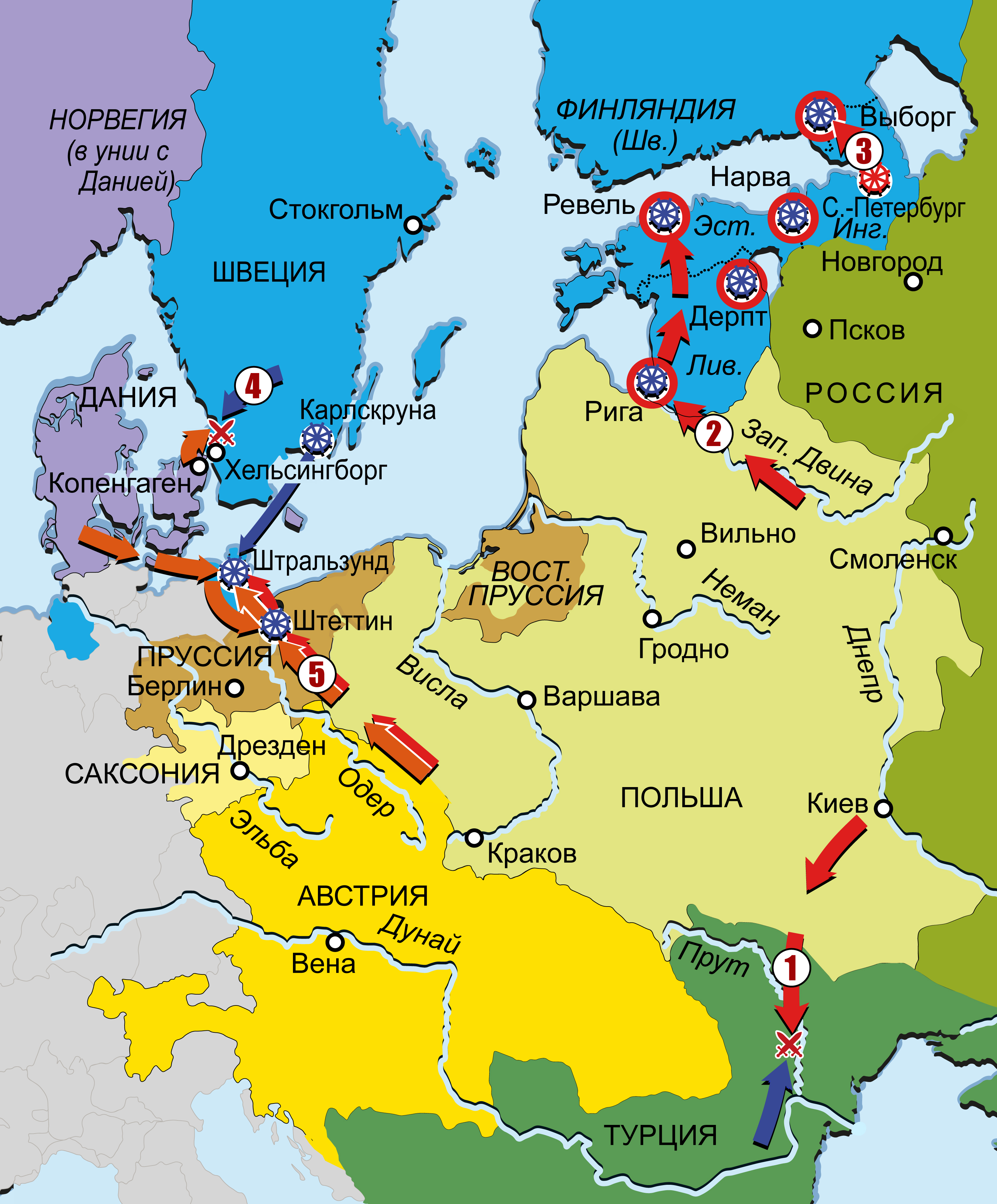 . Россия продолжает наступательные действия против шведов в Прибалтике и Финляндии: в 1710 г. взяты Рига