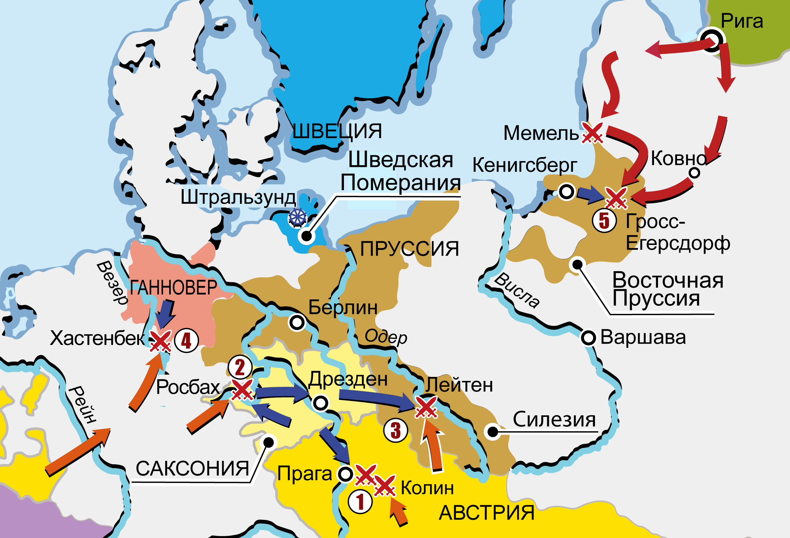 . Основные силы французских войск вынуждают войска Ганновера и ряда других союзных Англии и Пруссии германских княжеств отступить в битве при Хастенбеке (26 июля)[4]. Основные силы русской армии под командованием фельдмаршала Апраксина вторгаются в Восточную Пруссию со стороны Ковно, а затем наносят поражение прусской армии фельдмаршала фон Левальда в битве при Гросс-Егерсдорфе (19 августа)