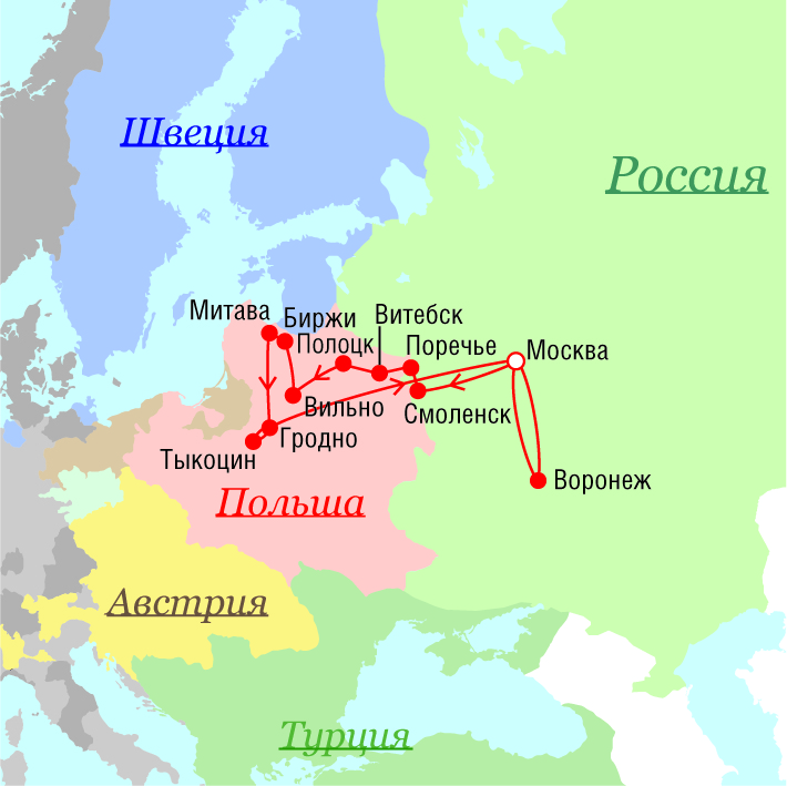 На карте указаны маршруты путешествий Петра I на каждый год. Расстояния приблизительно вычислены по российским дорожникам XVIII и XIX вв. Различия в длине маршрутов Петра и современного пути объясняются другой сеткой дорог. Длина маршрутов, на которые данные дорожников отсутствуют, была определена по электронным картам.