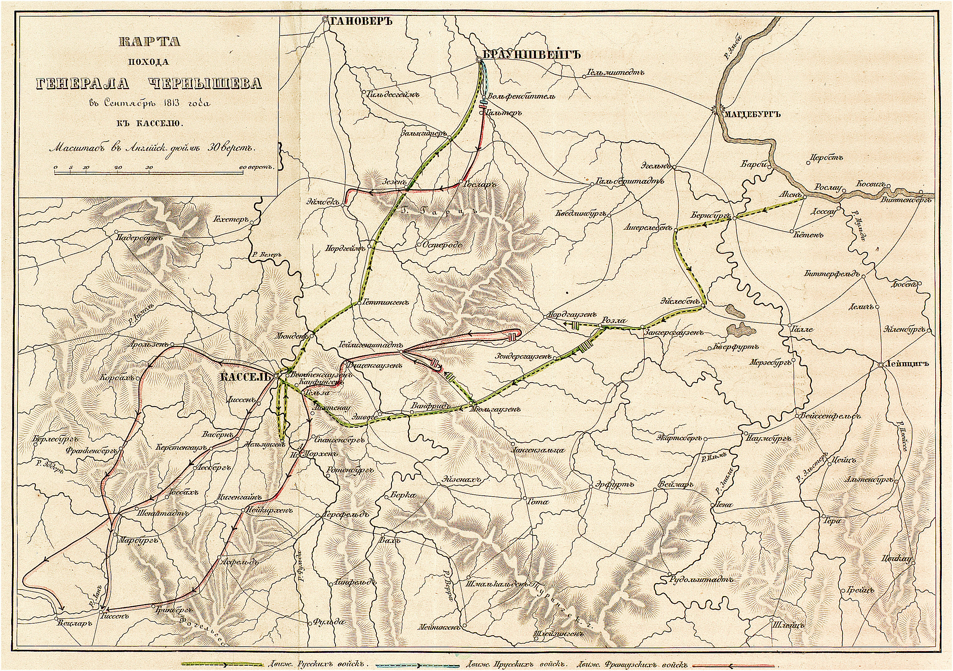 Карта похода генерала Чернышева в сентябре 1813 года к Касселю